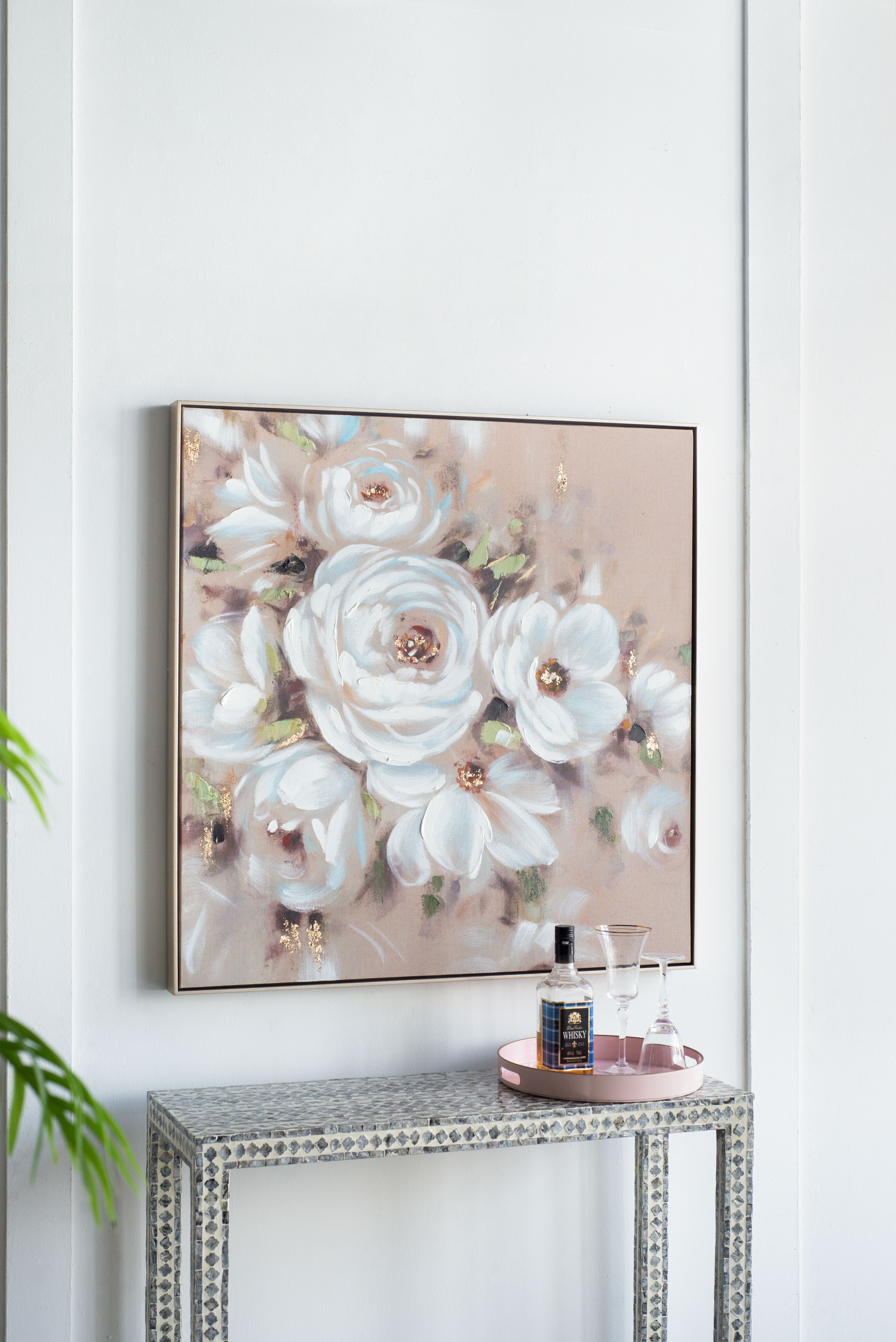 Soft delicate brush strokes create a bouquet of graceful blooms in the Alexandra framed wall art. With subtle tones of beige, ivory, and just a hint of green these blossoms easily fit within any color palette