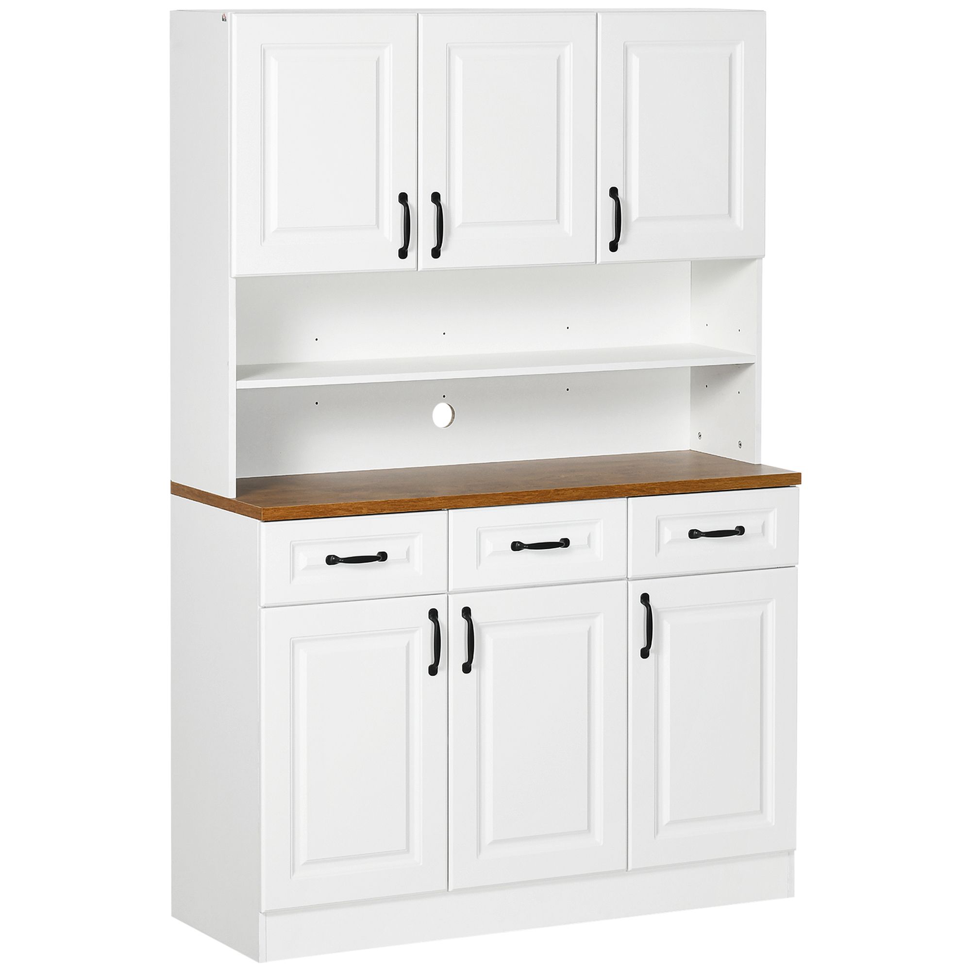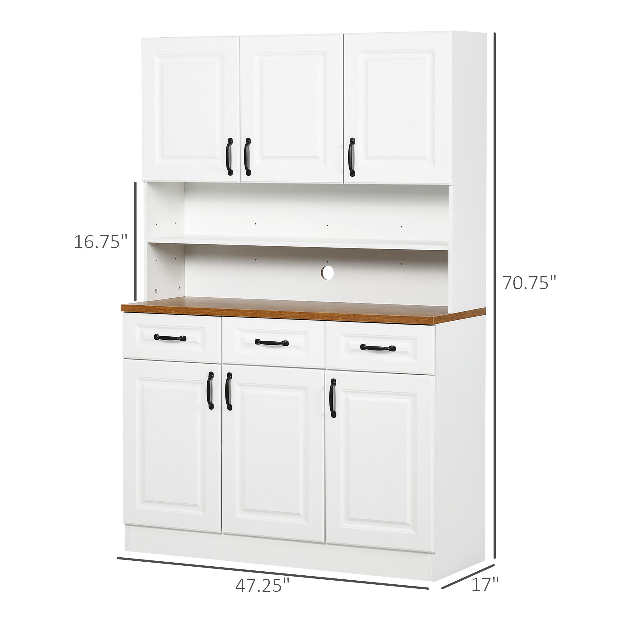 1.- Maximize Kitchen Storage: Our kitchen hutch offers six cabinets and three drawers, providing ample space for dishes, pots, pans, and silverware, making it a perfect storage solution.