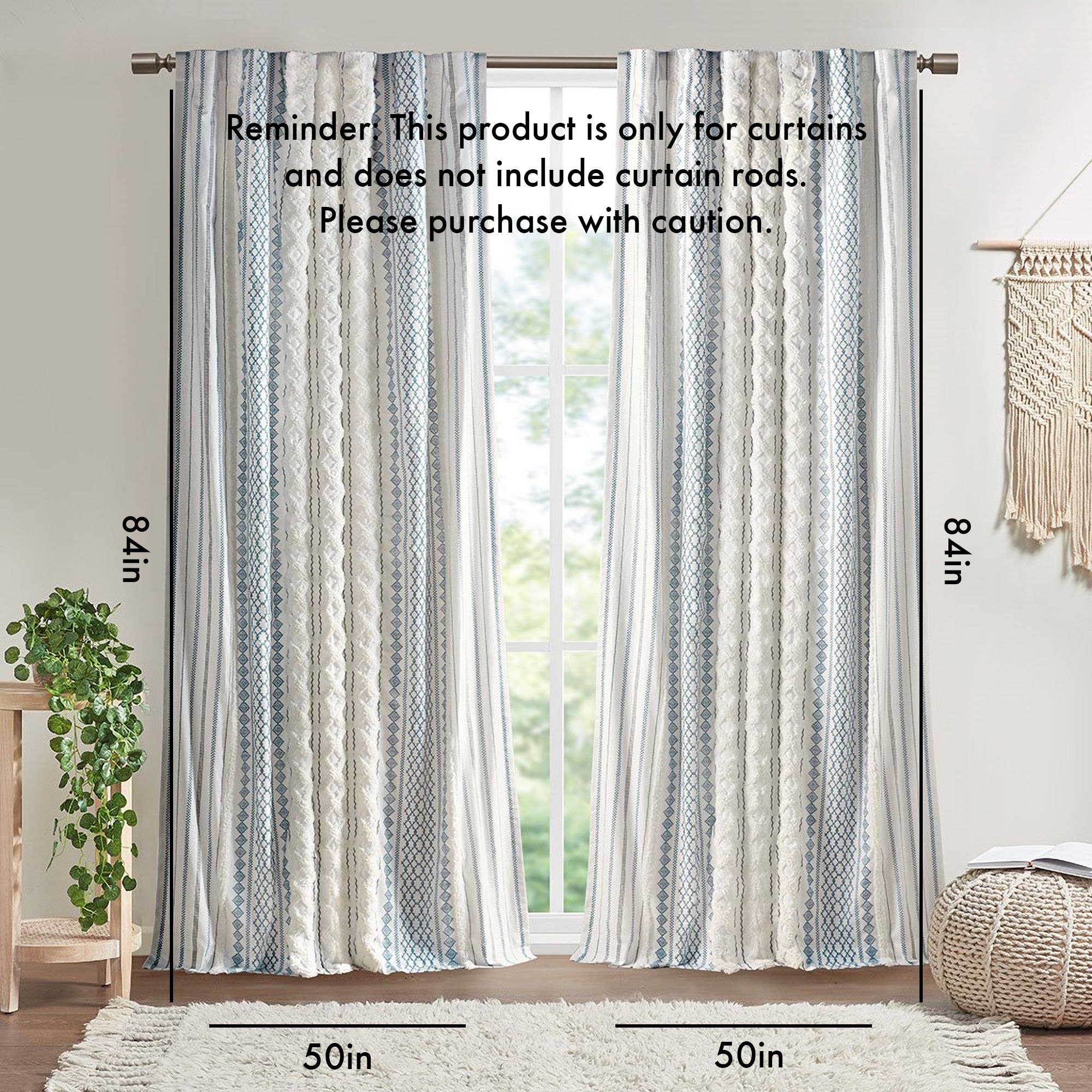 100% cotton printed with tufted chenille stripe trim window curtain panel