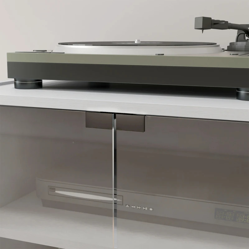 Home > 4-Tier Media Cabinet, Media Stand With Adjustable Shelves, Tempered Glass Doors, And Cable Management, Distressed White