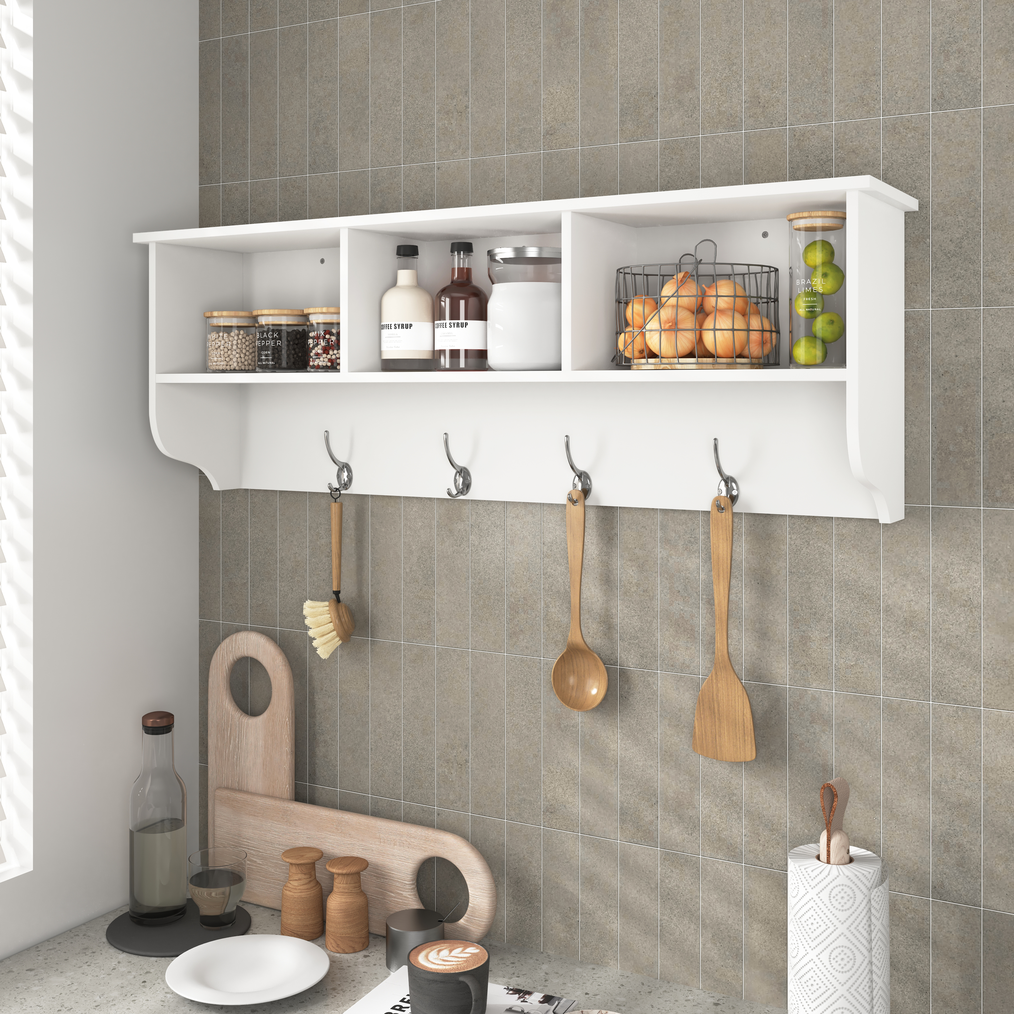 Home > White Entryway Wall Mounted Coat Rack With 4 Dual Hooks Living Room Wooden Storage Shelf