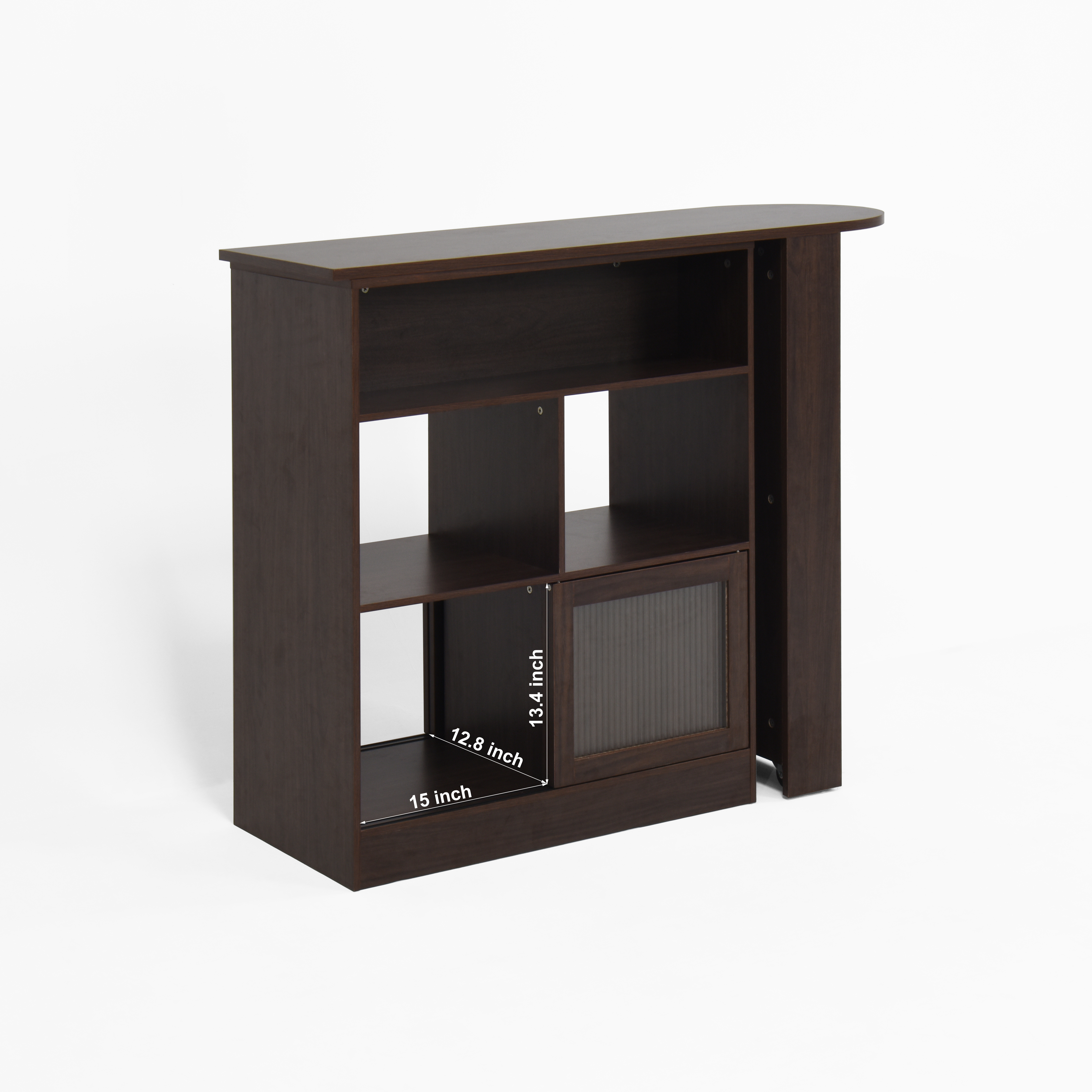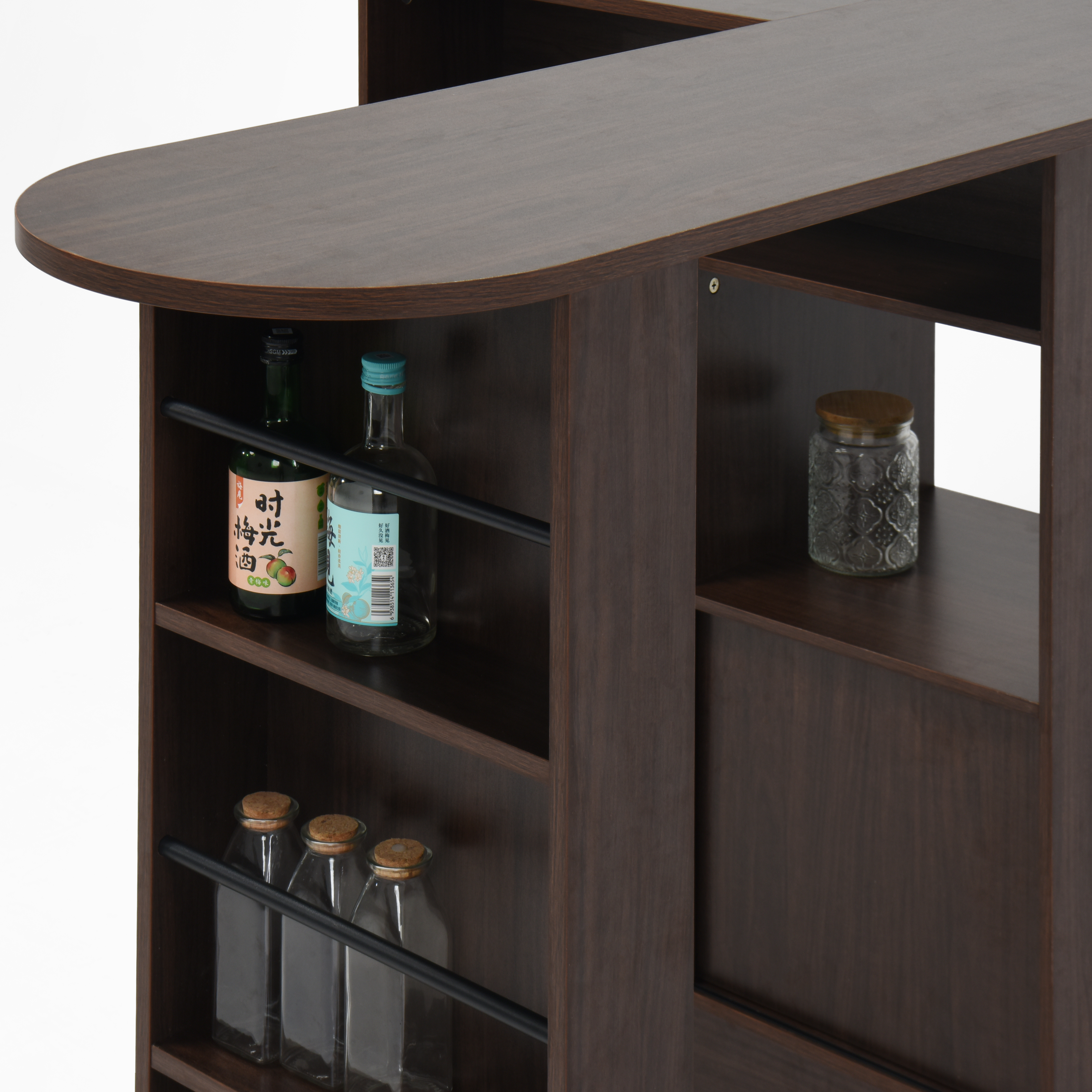 • Storage Shelf: 6 Storage Space provides ample storage for your food, and magazines. Sliding glass doors at the bottom provide enclosed Spaces for your food. The open shelves are armed with side guardrails provide ample storage for your glassware, preventing items from falling out