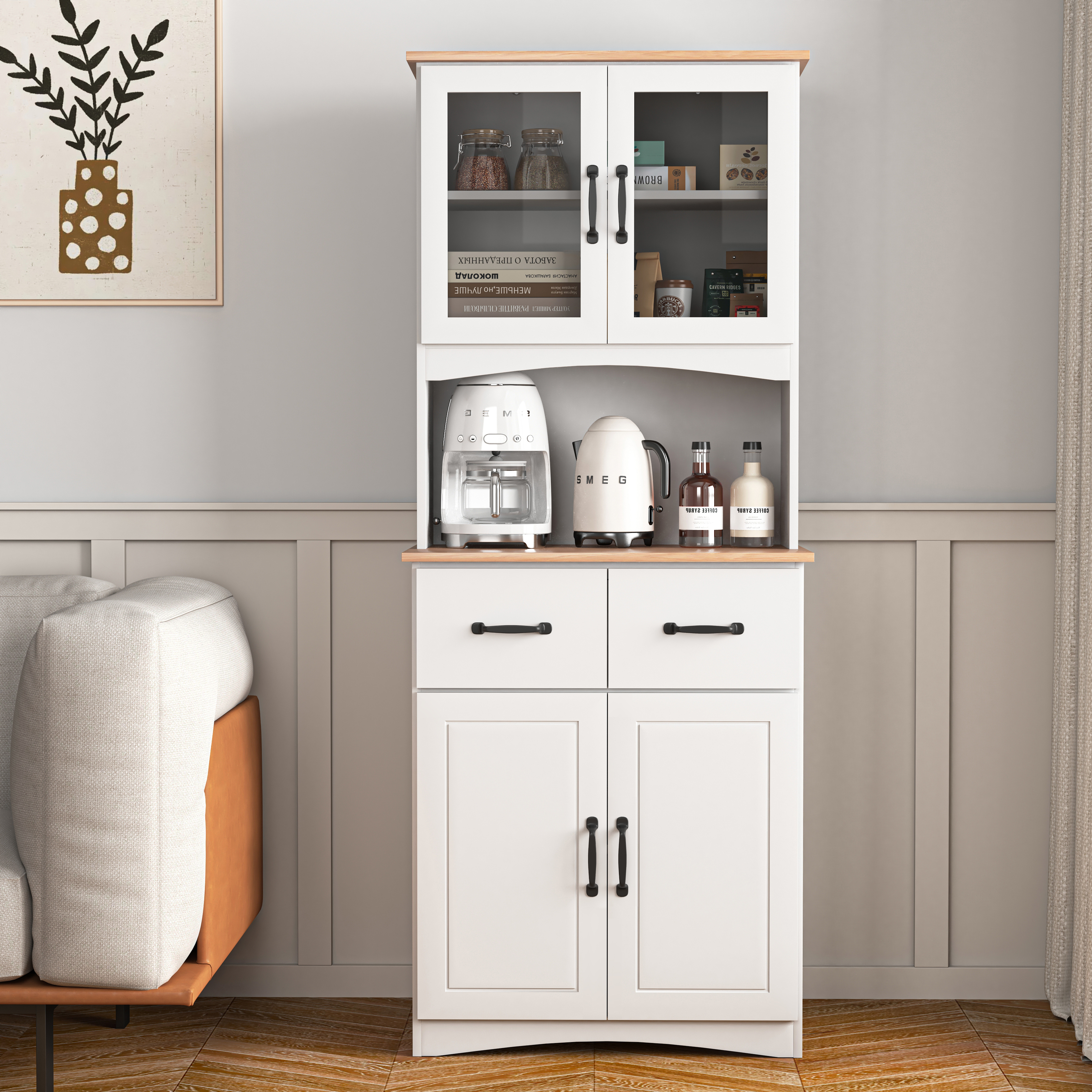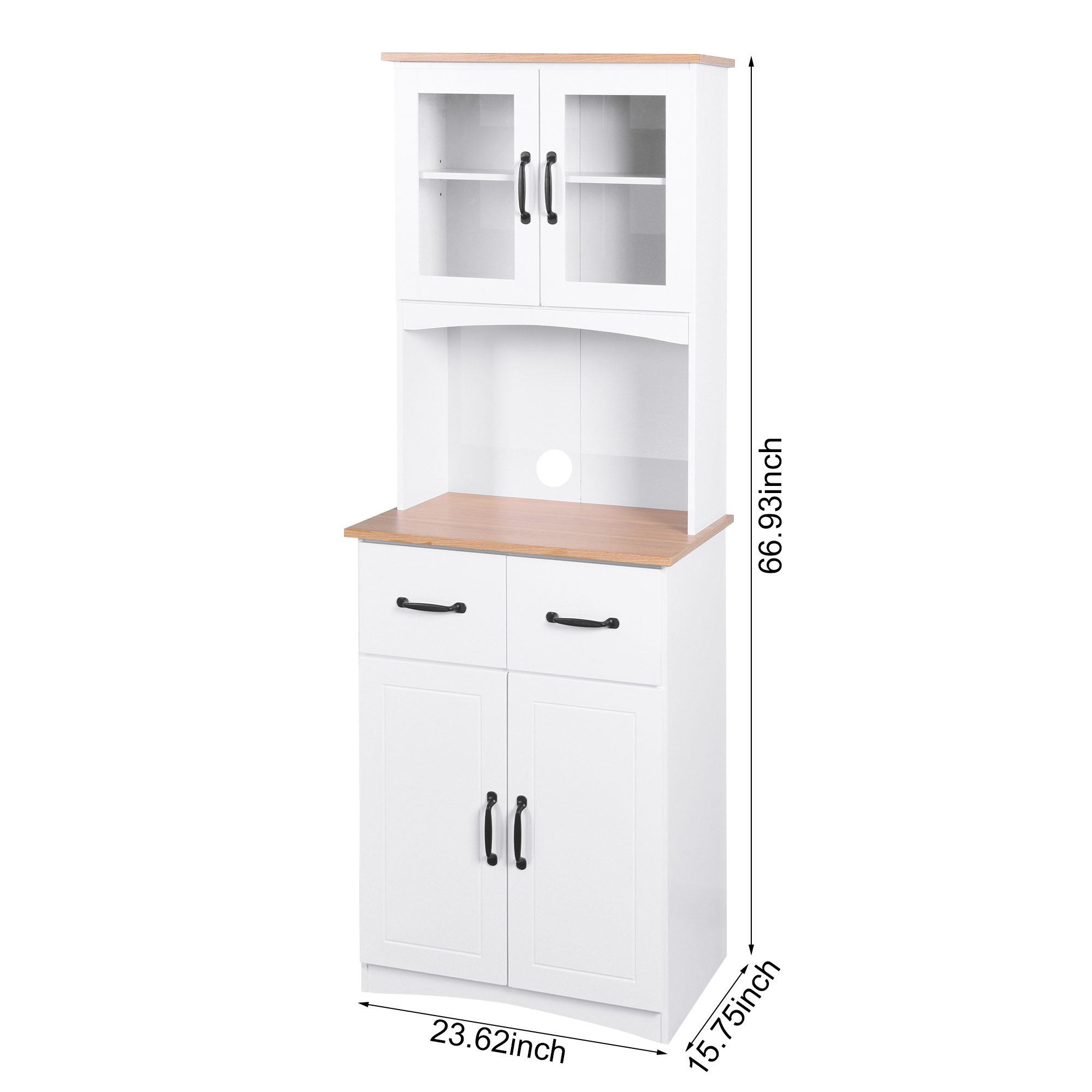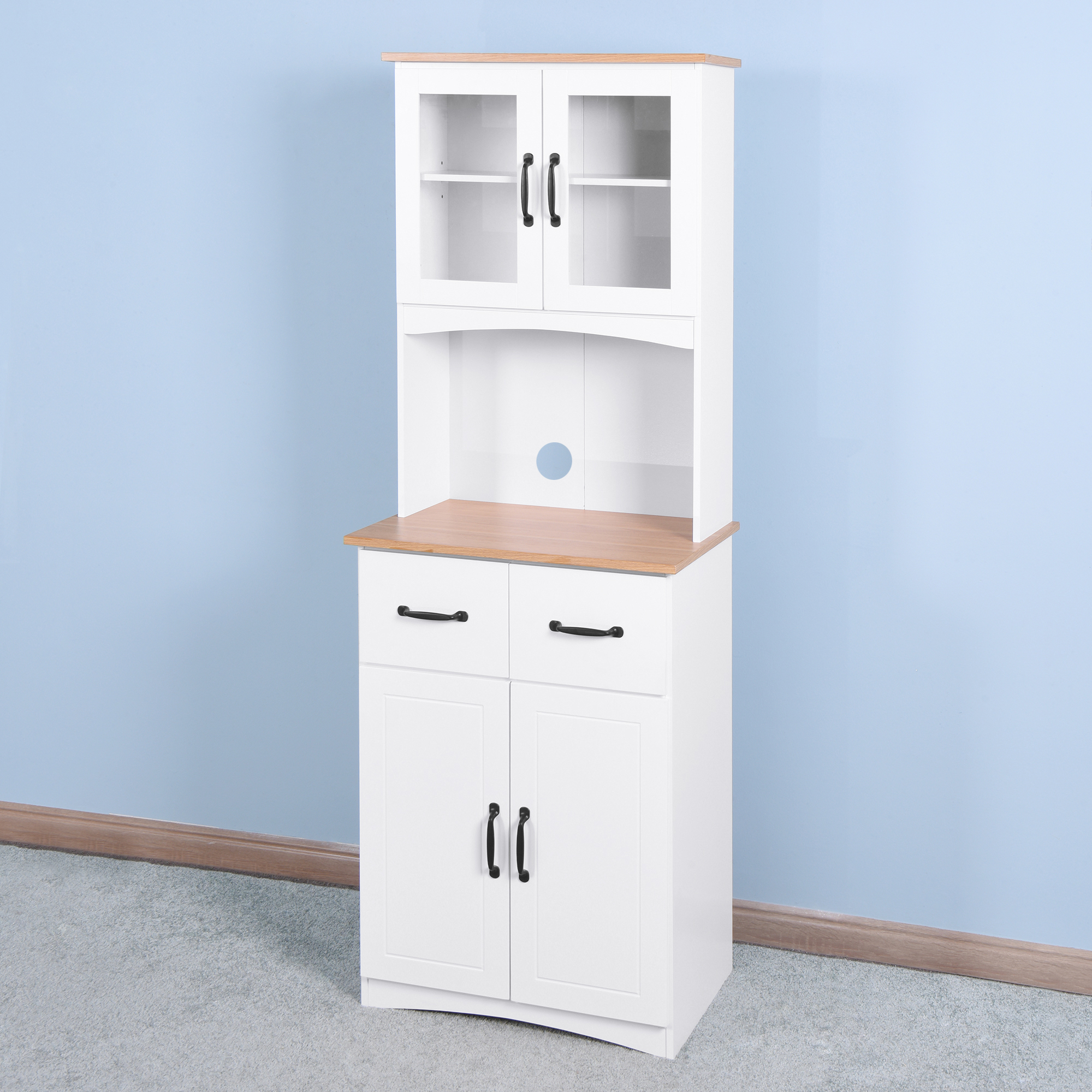 • Ample Storage: Featuring 2 upper door cabinets, 2 lower door cabinets, 2 drawers, and 1 open center countertop, this hutch cabinet has sufficient space for you to take advantage and keep your dishes , towels, utensils, and kitchen appliances clean and organized.