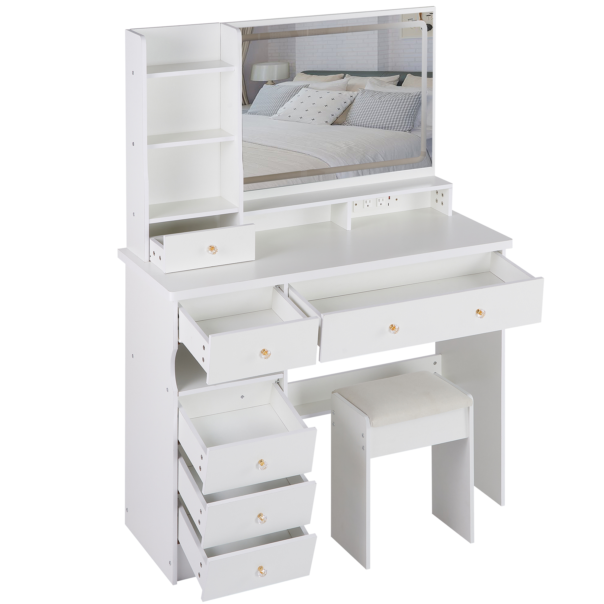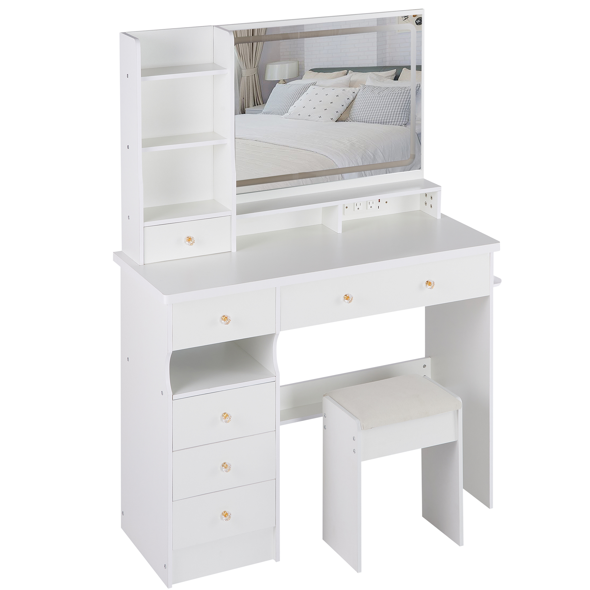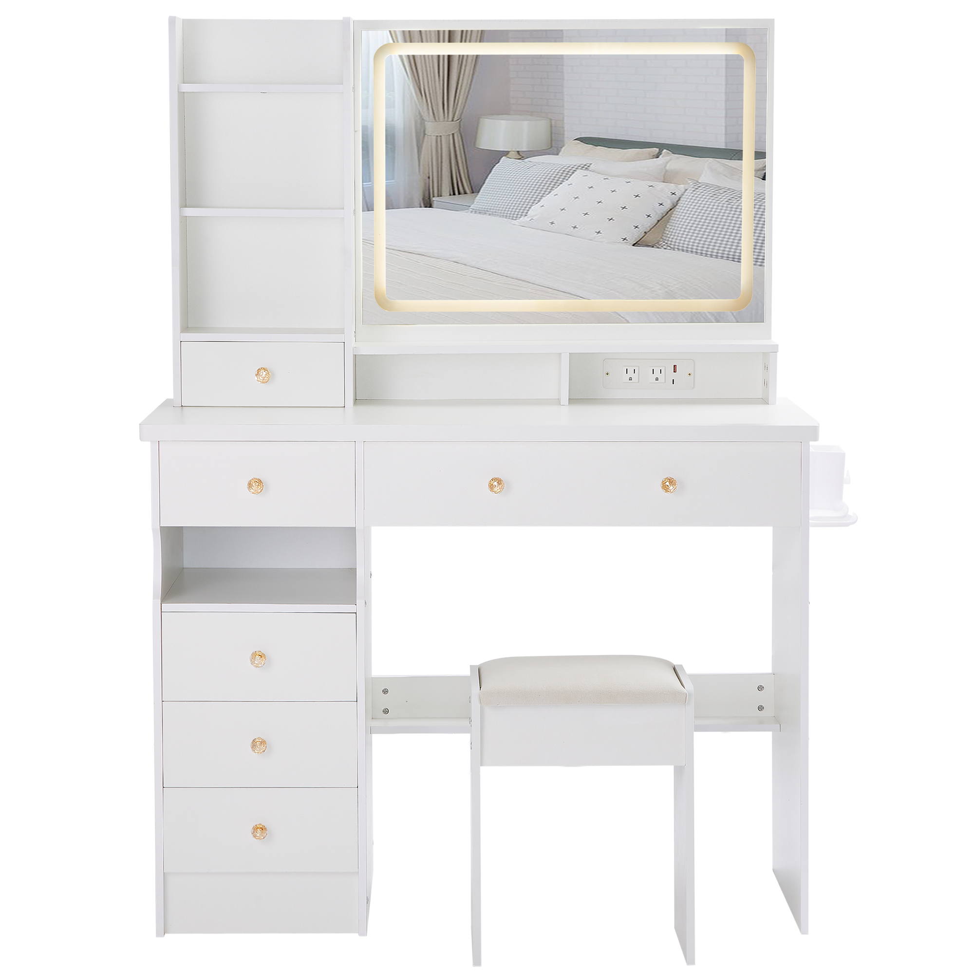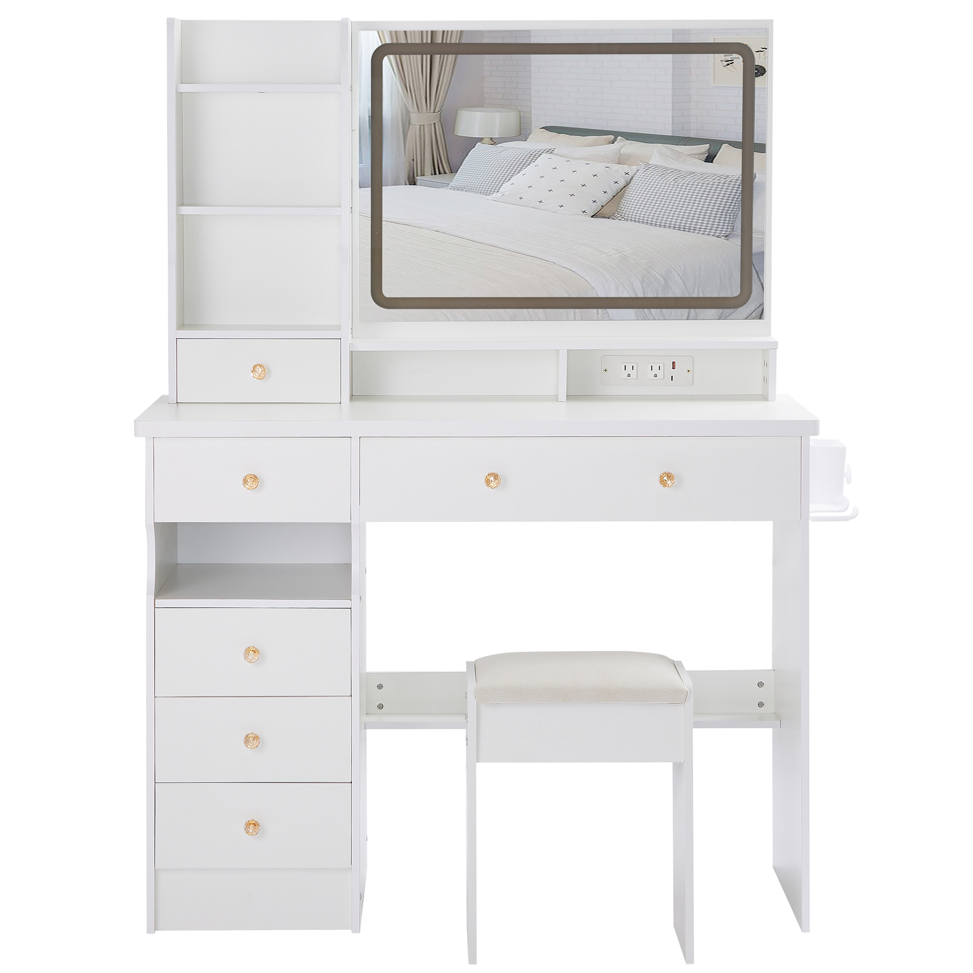 41 Large Size Left Drawer Desktop Vanity Table Cushioned Stool Dresser Set, 2 AC- 2 USB Power Station, Hair Dryer Stand, Extra Large Touch Control LED