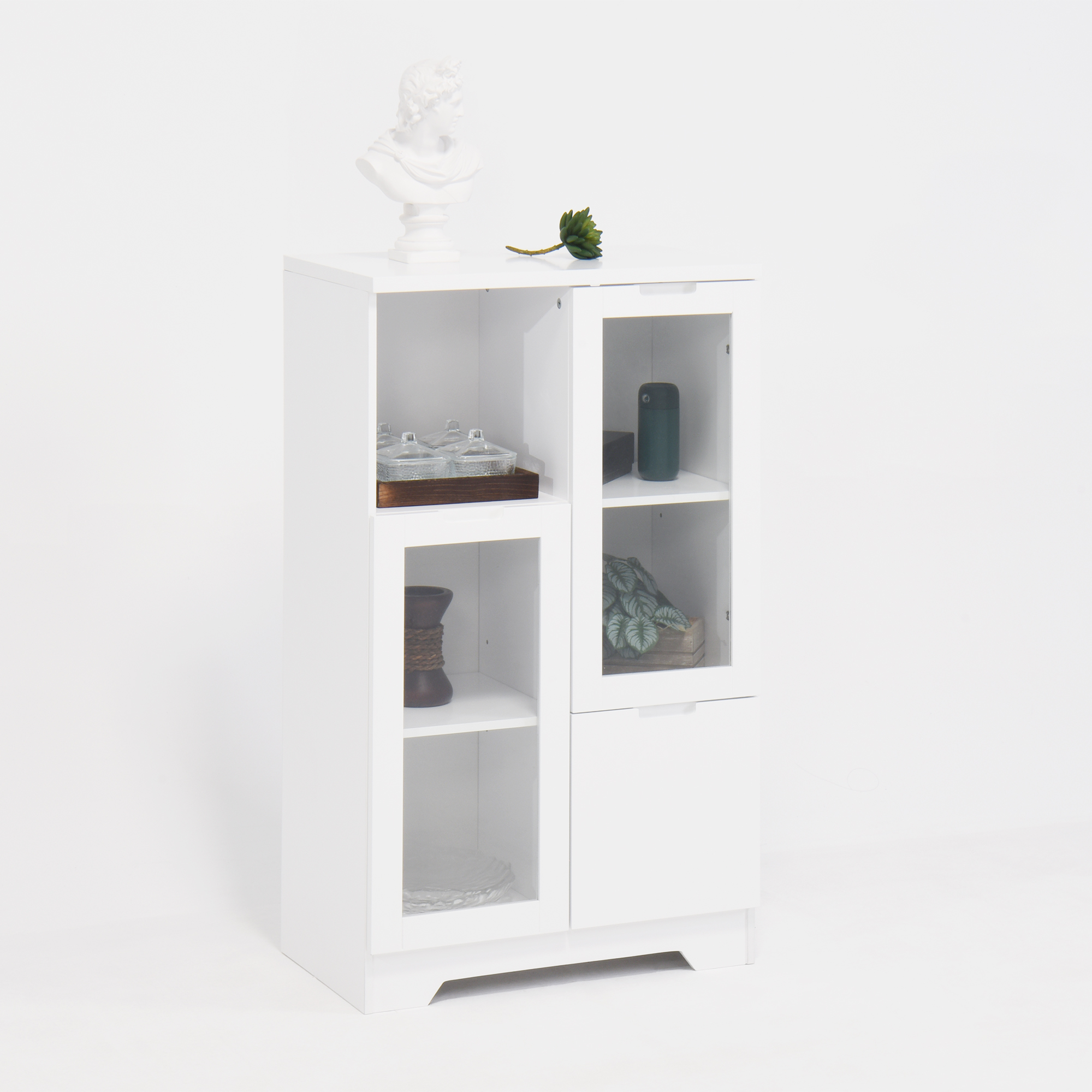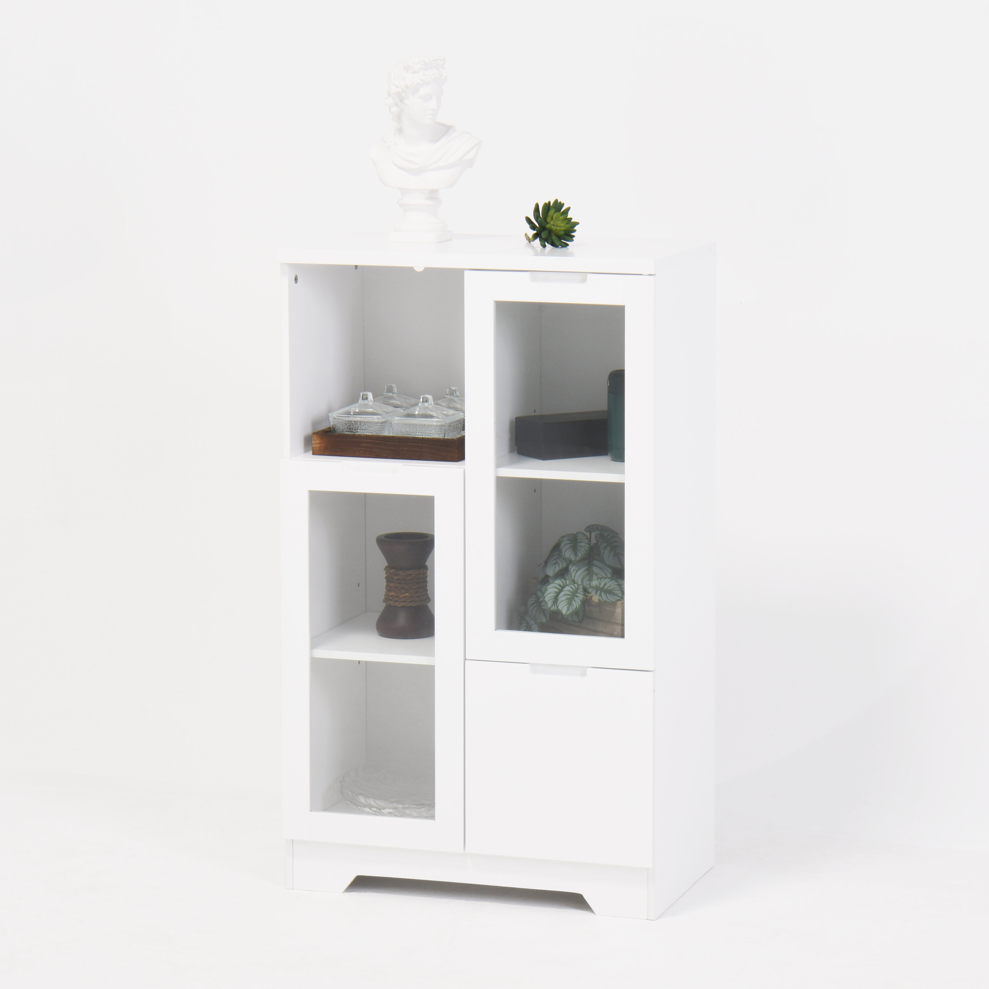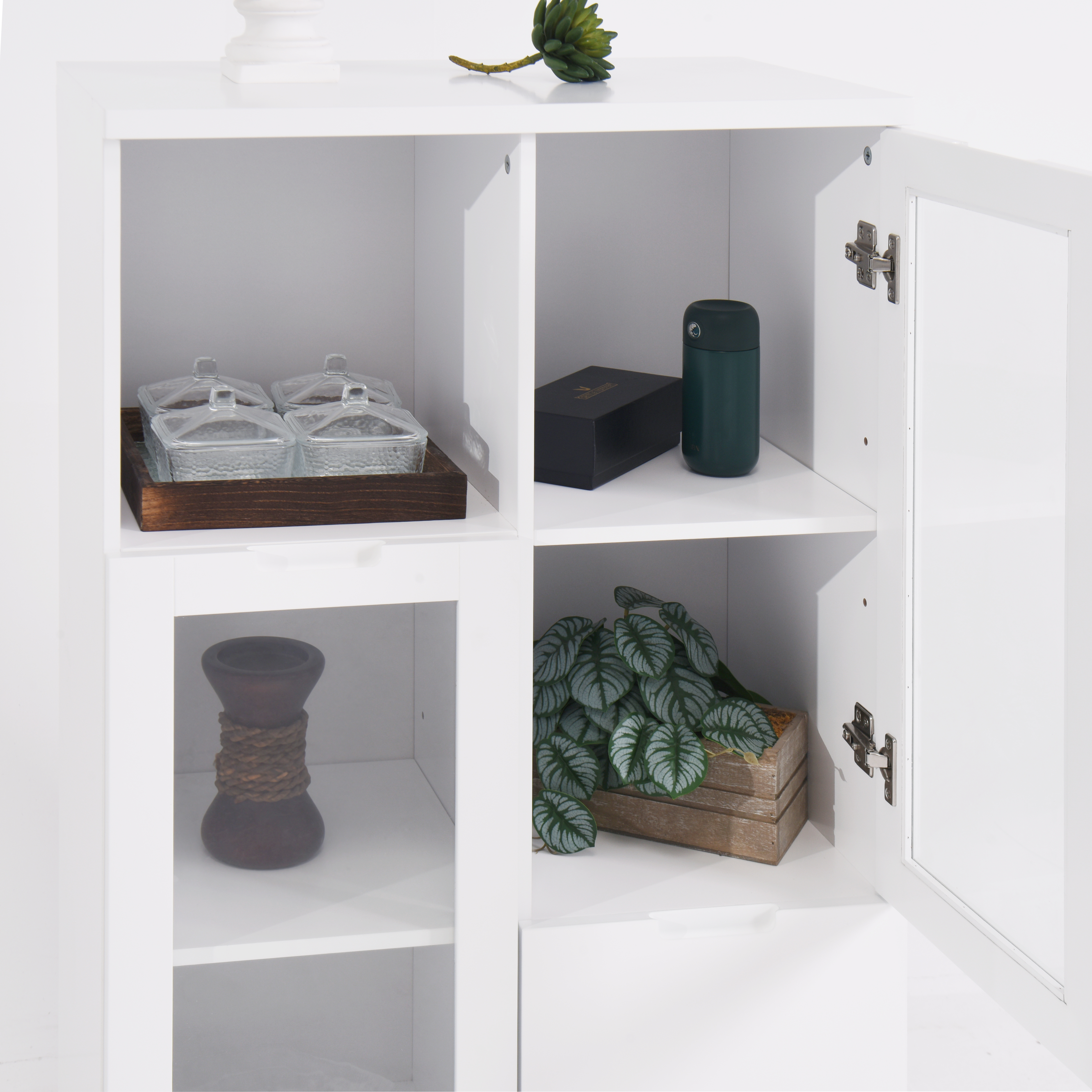 • Multipurpose cabinet offers plenty of functional storage. Looks great in your living room, entryway, bedroom ,dining room, condo or office. Features 2 glass doors that open to two adjustable shelves for versatile storage,and 2 storage compartment
