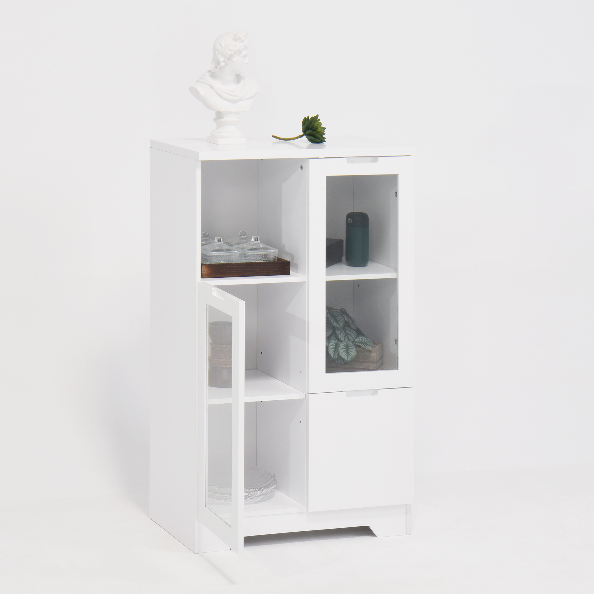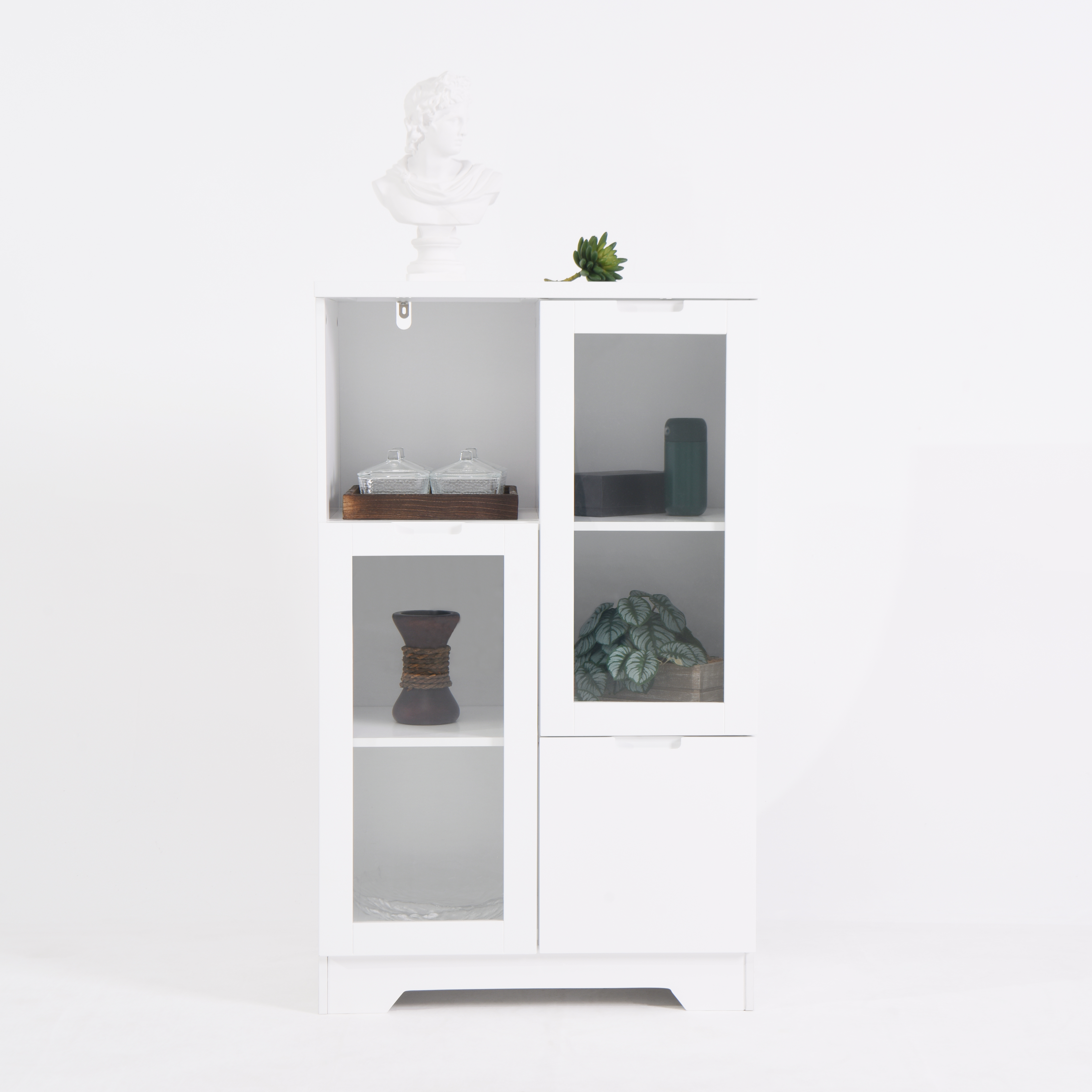 • White Color Design: Modern style and decorative 2 doors with glass inside make it fascinating in any room space. Handleless design feelings of exquisite. Combining elegance, modern feeling. Unique appearance and classic style make it matched in kinds of living space styles. This storage cabinet being practical to meet various storage needs.
