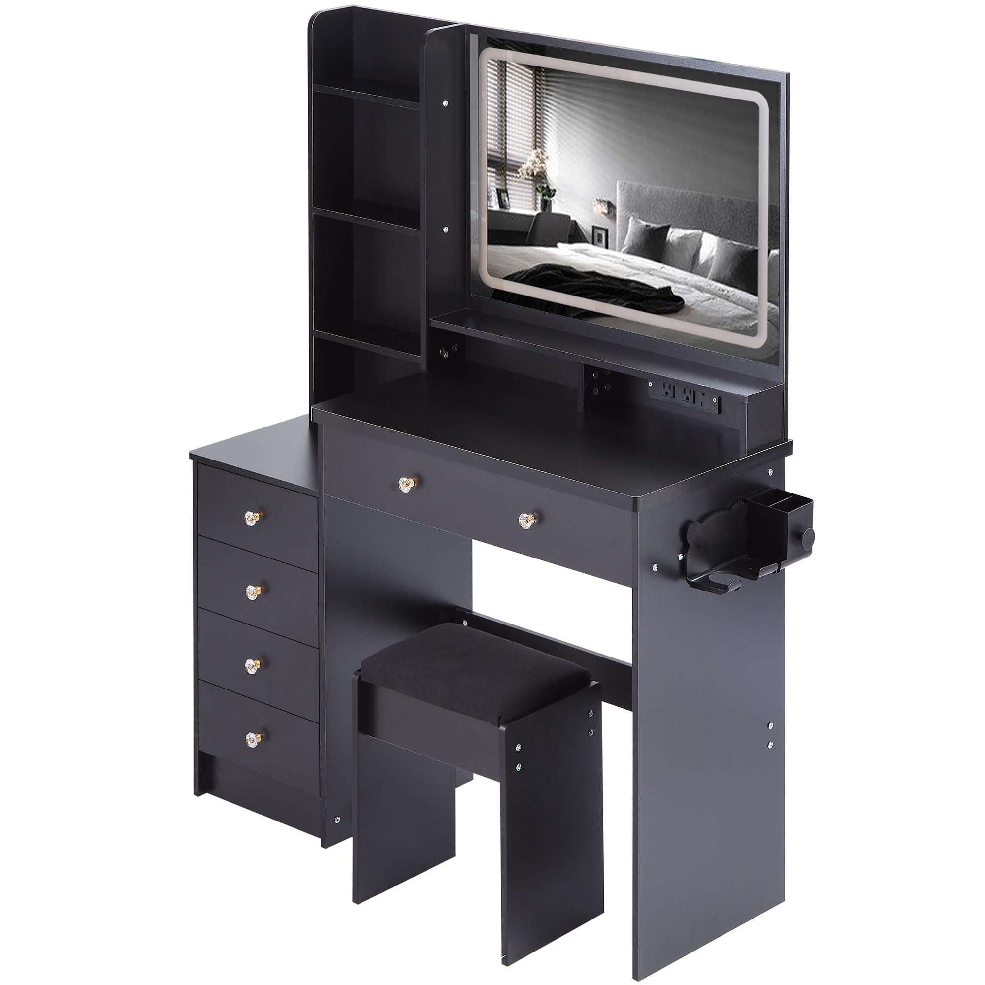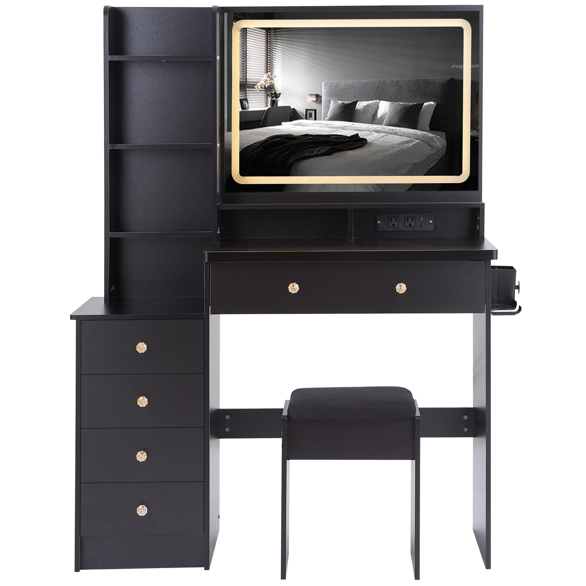 Home > 41 Large Size Left Bedside Cabinet Vanity Table Cushioned Stool Dresser Set, 2 AC 2 USB Power Station, Hair Dryer Stand, Extra Large Touch Control LED