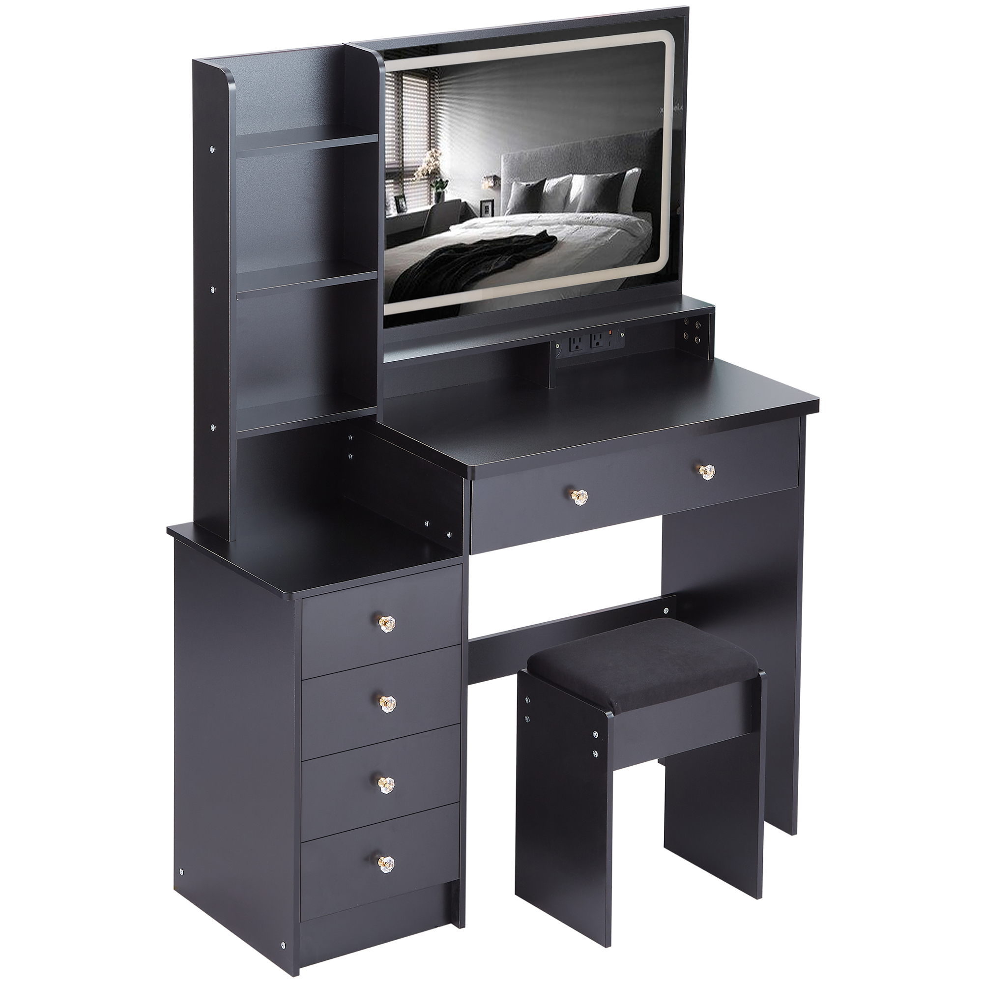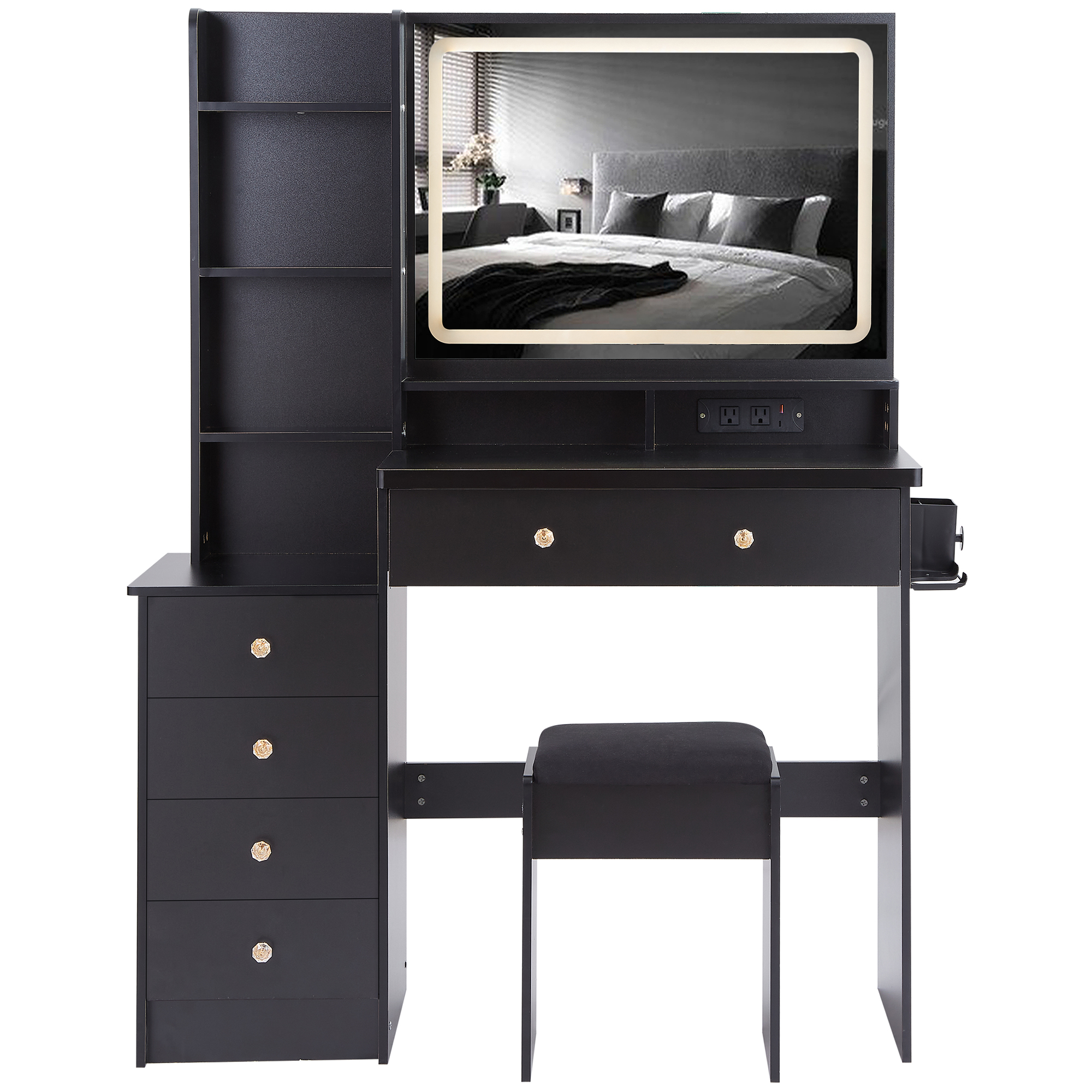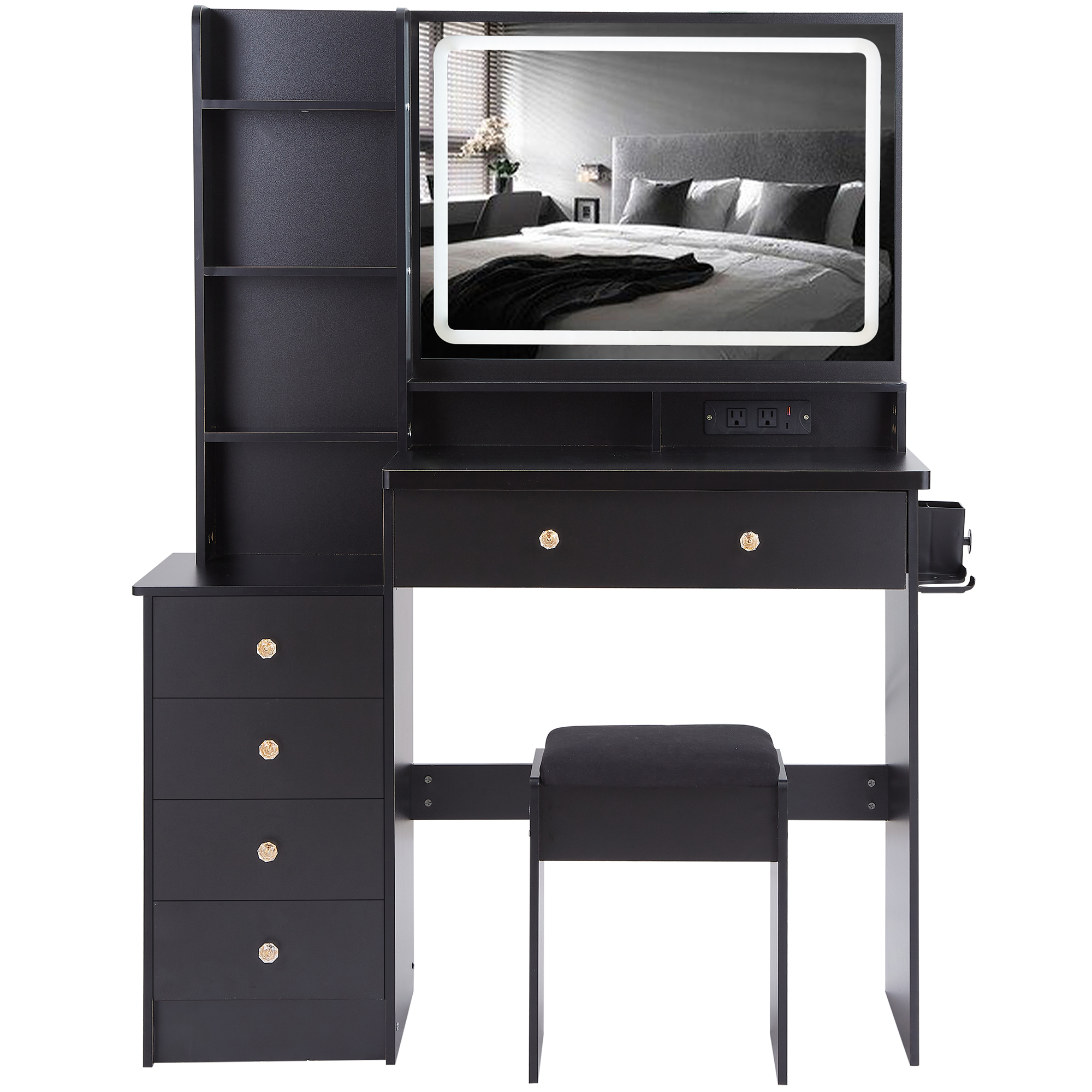 Product Name:41" Large Size Left Bedside Cabinet Vanity Table+Cushioned Stool Dresser Set, 2 AC+2 USB Power Station, Hair Dryer Stand, Extra Large Touch Control LED Mirror, 3-color Switch, EPA, GCC, UL Certificate