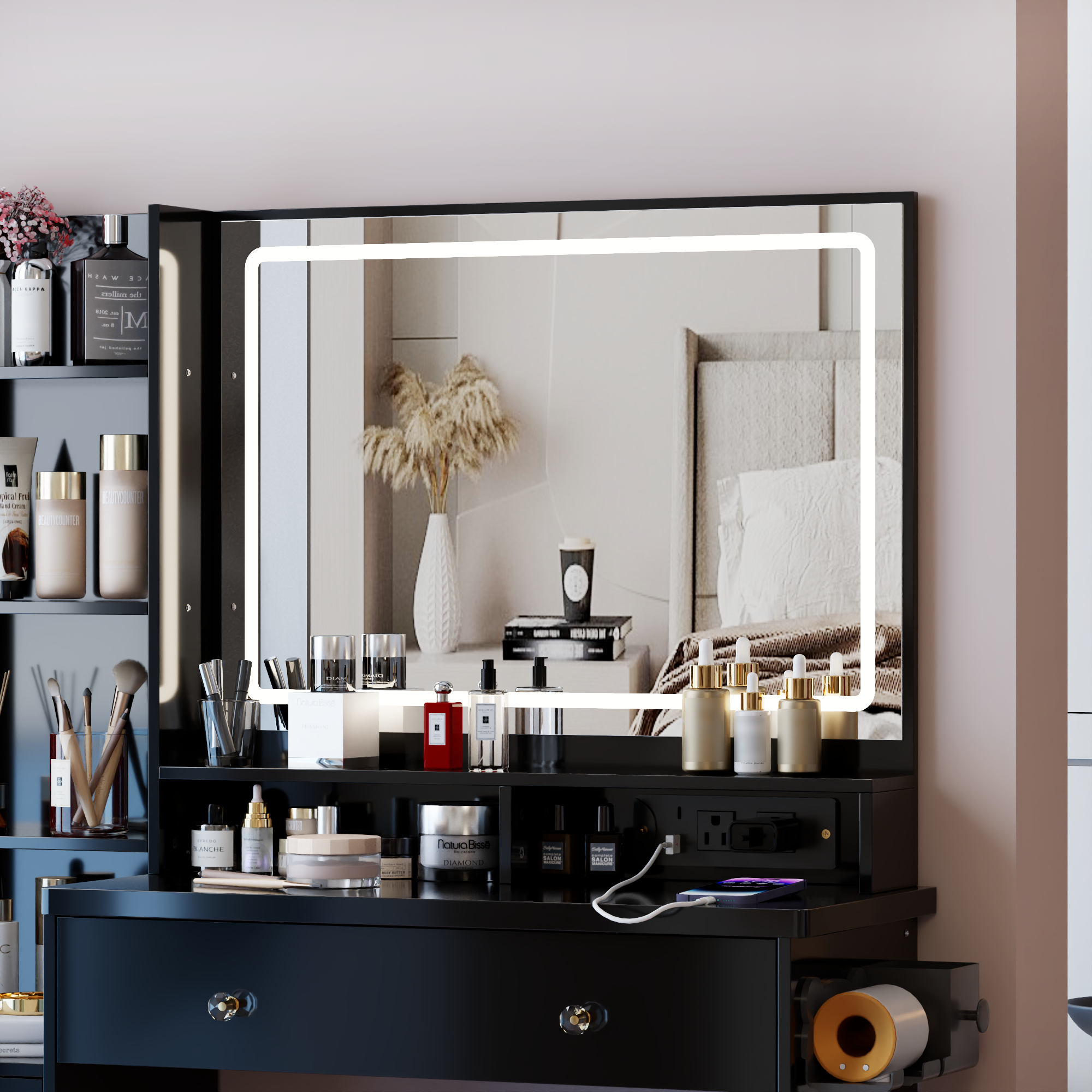 • [2 AC powers and 2 USB ports built-in socket]: Equipped with 2 built-in AC powers and 2 USB ports socket, it can conveniently charge phones and tablets while you are dressing up. Two AC power sources allow you use both a curler and a hair dryer simultaneously.