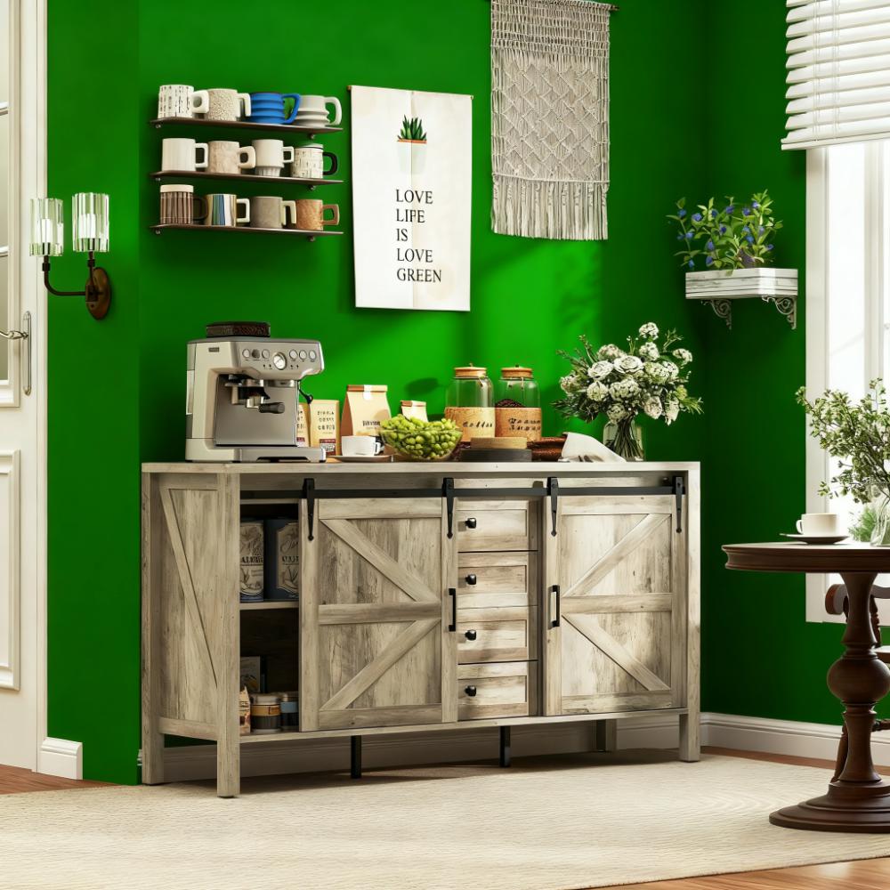 Features: - Wide countertop comfortably for brewing essentials, such as cups, coffee maker, and kettle - Four drawers and two side cabinets with three-level adjustable shelves - Classic sliding barn doors, black metal accents, and vintage handles add farmhouse charm - Great as a kitchen storage cabinet, TV stand, credenza, or entryway cabinet - MDF and particleboard frame with 0.9" thick top supports up to 260 lbs. - Supported by six legs with anti-slip foot pads and anti-tipping devices for stability - 4.9" gap below allows for easy vacuuming underneath - Assembly required Specification: - Color: Gray Wash - Materials: MDF, Particleboard, Metal - Overall Dimensions: 59.2" W x 15.4" D x 31.5" H - Tabletop Thickness: 0.9" - Drawer Inner Size: 16.6" W x 11.2" D x 3.1" H - Cabinet Inner Size: 18.1" W x 12.2" D x 25.2" H - Bottom Height to Floor: 4.9" - Weight Capacity: 260 lbs. (total), 88 lbs. (top), 66 lbs. (bottom board), 17.6 lbs. (shelf/drawer) Package Includes: - 1 x Sideboard - 1 x Manual