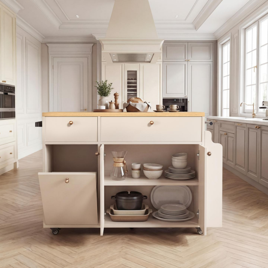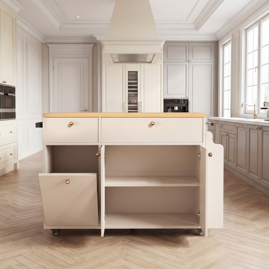 • 2.KITCHEN ISLAND WITH AMPLE STORAGE – Features multiple drawers, open shelves, spice rack, towel bar, and side hooks; organizes utensils, pots, spices, and daily items; keeps counters clear and kitchen tidy.