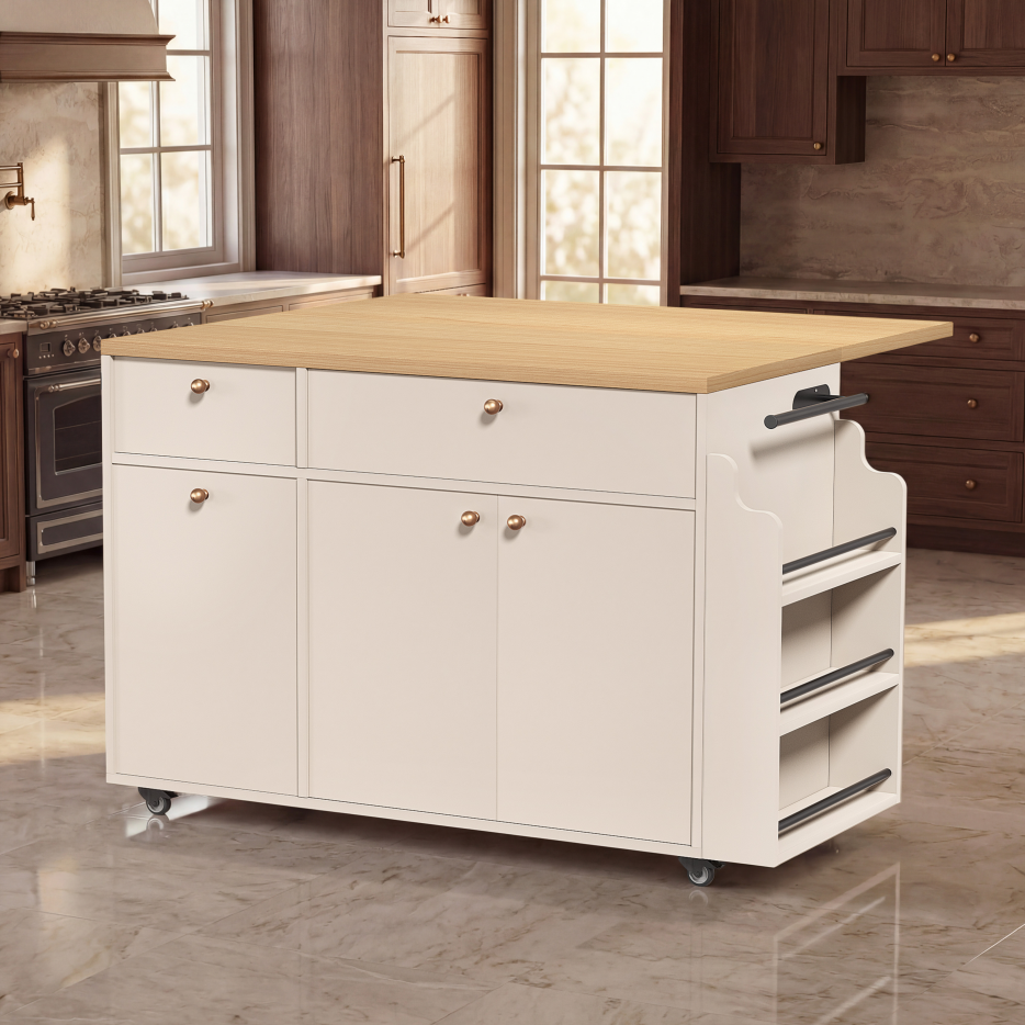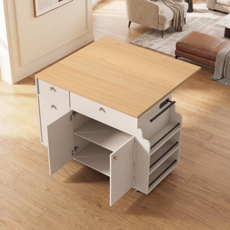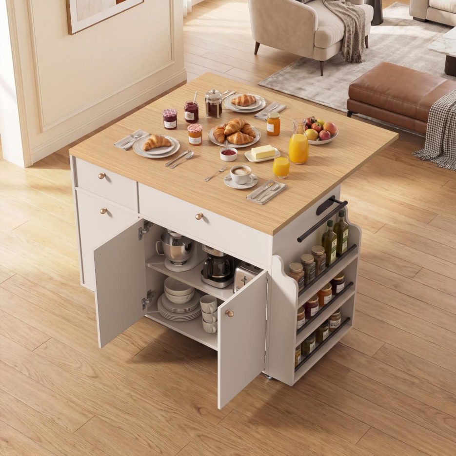 Home > Kitchen Island With Storage Rolling Kitchen Island Cart With Drop Leaf Extension, Natural Wood Top, Drawers, Spice Rack, Towel Bar, Mobile Kitchen Car