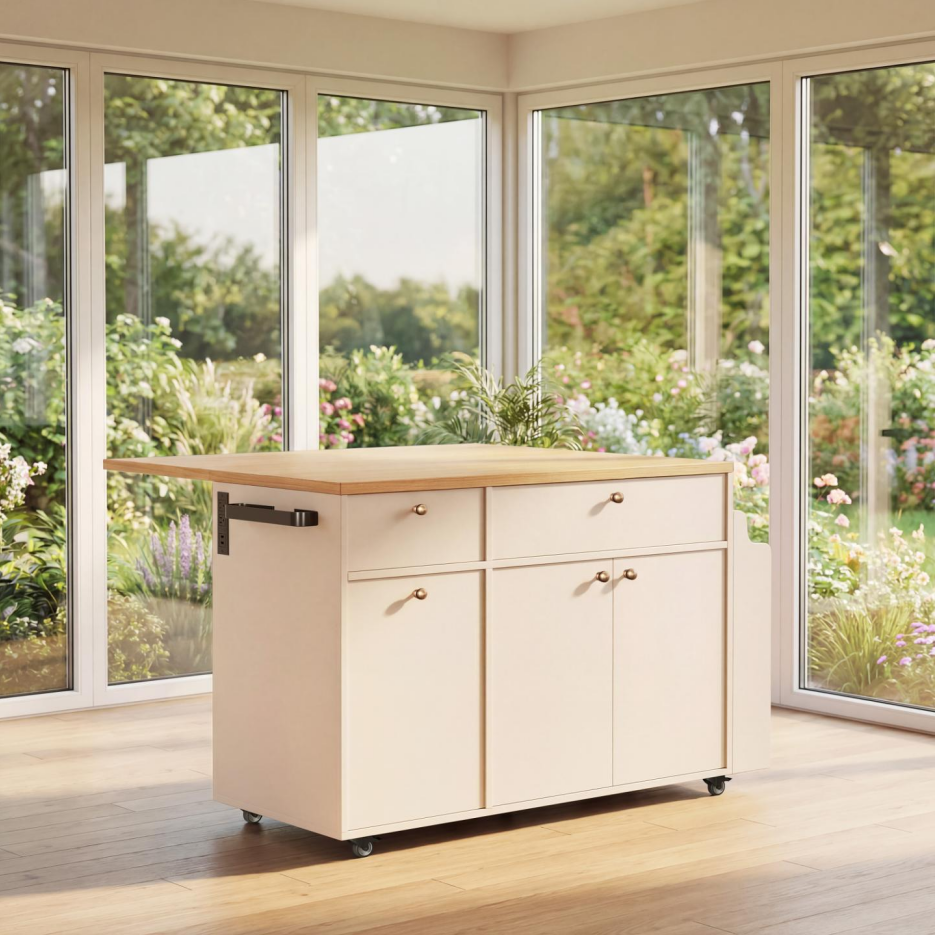 Product Name:Kitchen Island with Storage Rolling Kitchen Island Cart with Drop Leaf Extension, Natural wood Top, Drawers, Spice Rack, Towel Bar, Mobile Kitchen Cart for Kitchen & Dining Room, White