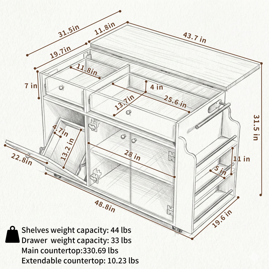 • 3.MOBILE KITCHEN ISLAND FOR VERSATILE USE – Compact size (48.8" L x 31.5" W x 31.5" H) fits small apartments yet expands for family meals; multi-level storage suits kitchen island cart, coffee bar, or dining prep station needs.