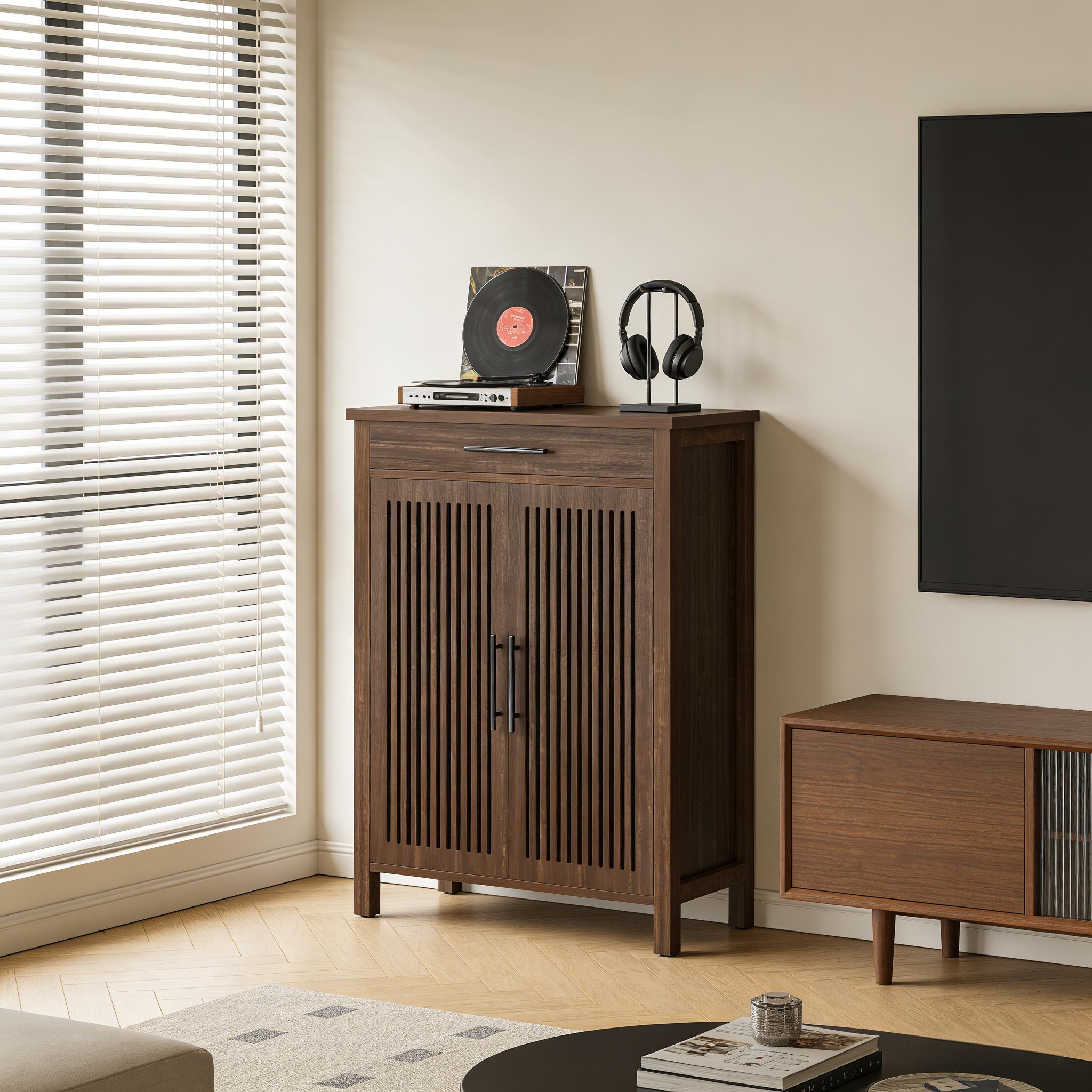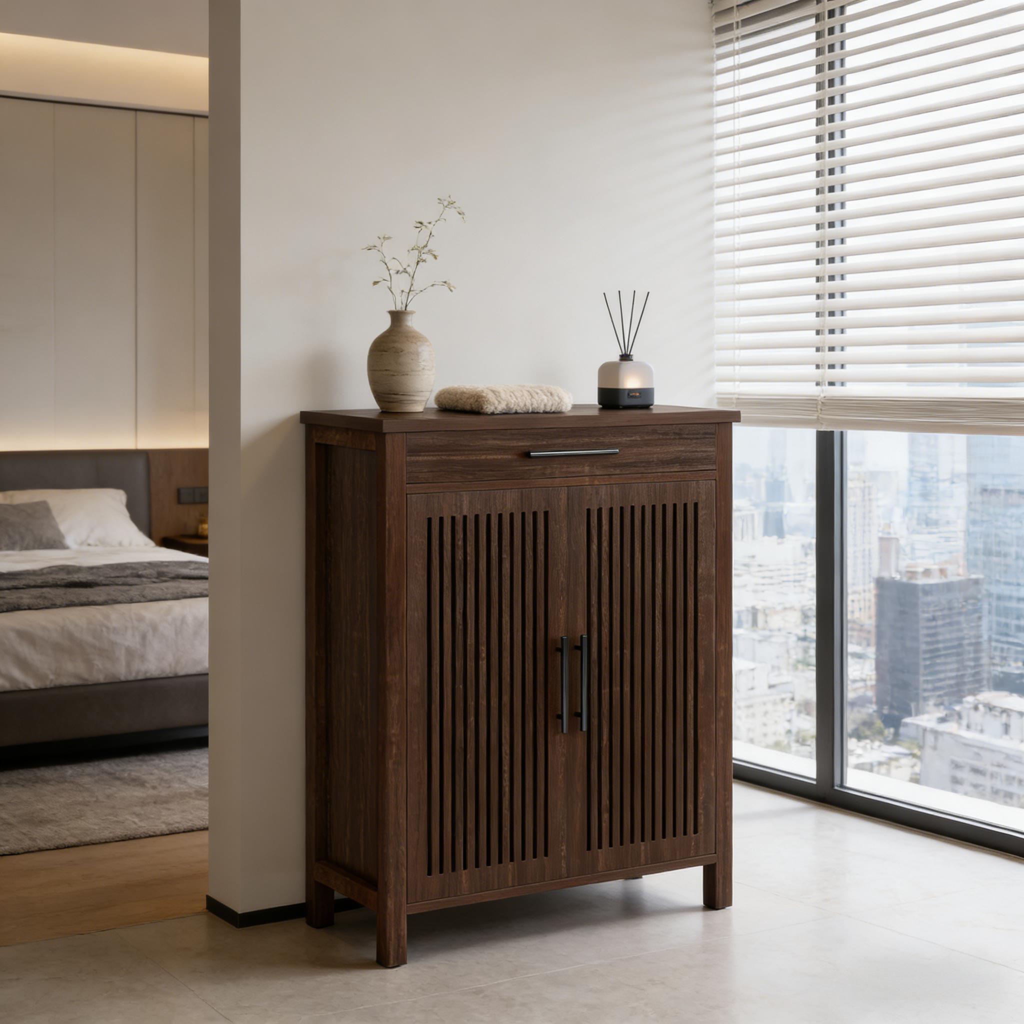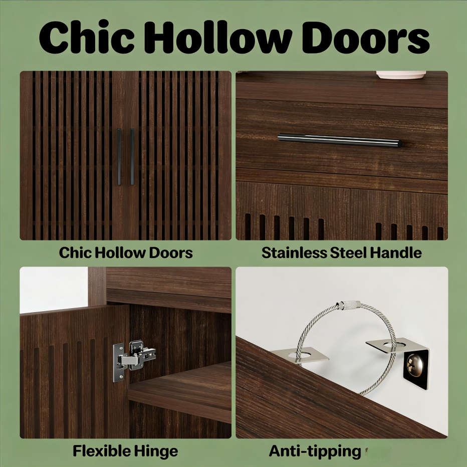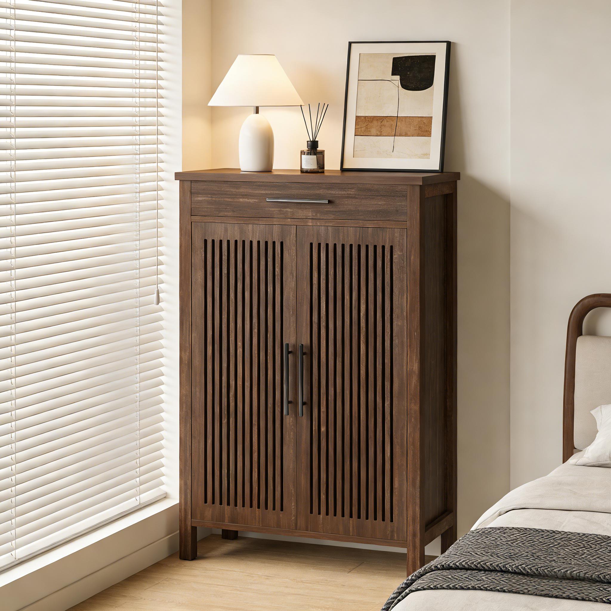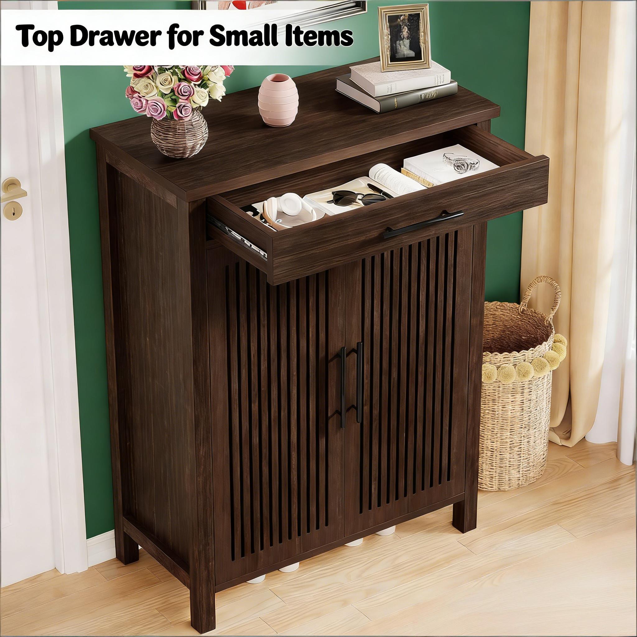 Important Reminder!!! 1) Attention: All products in our store do not support Canada self pickup ordering. Please do not create shipping labels for Canada. Our American products do not support self pickup to Canada 2)We do not ship to Alaska, Hawaii, US protectorates (e.g., Puerto Rico), P.O. boxes, or APO/FPO addresse 3)We don’t accept non-defective remorse returns Vintage Design with Modern Twist - This shoe cabinet blends vintage charm and modern style with its two louvered doors, offering sufficient air flow and excellent shoe storage. The rustic brown finish brings enduring appeal to your home. Flexible Shoe Storage - The farmhouse style shoe cabinet with drawer offers five adaptable tiers capable of holding up to 20 pairs of shoes, with removable dividers that can accommodate various sizes and styles. Spacious Drawer & Display Area - The cabinet features a roomy drawer for easy access to daily items such as keys or sunglasses. Use the spacious tabletop for displaying decor to enhance your home's style. Sturdy & Safe Structure - This freestanding shoe rack, crafted from quality MDF, can support heavier items. Adjustable foot pads and anti-tip devices ensure safety and stability. Easy Setup - Assembly is straightforward with detailed instructions and hardware included.