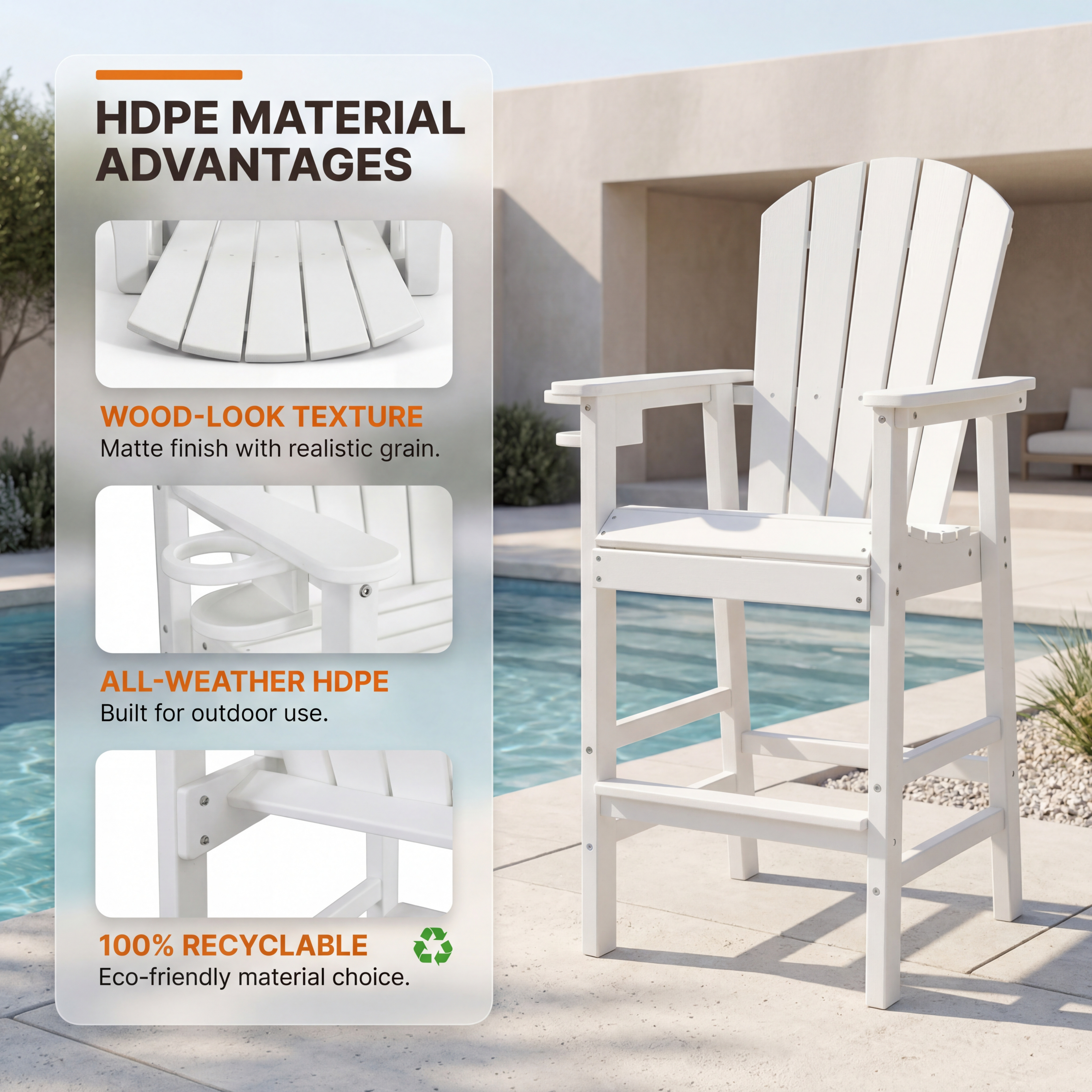 Product Name:All-Weather HDPE Bar Height Adirondack Chair, Outdoor Patio Bar Chair with Armrests & Cup Holder, UV/Weather Resistant, White 1 Piece (WH)