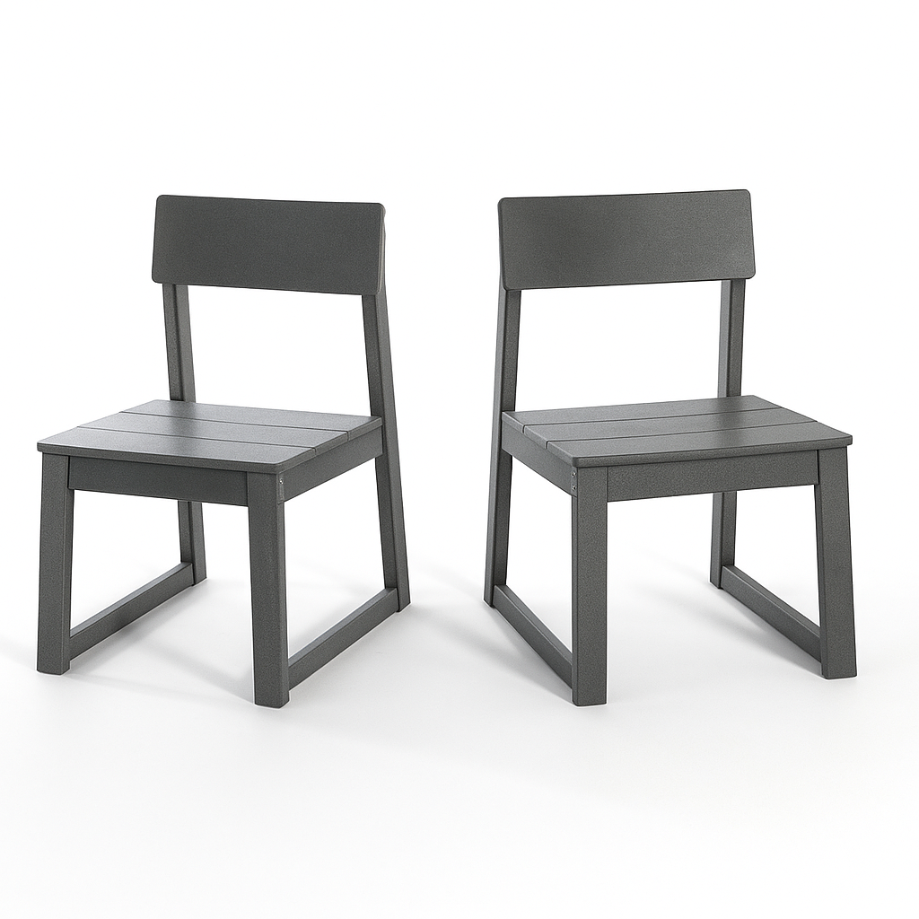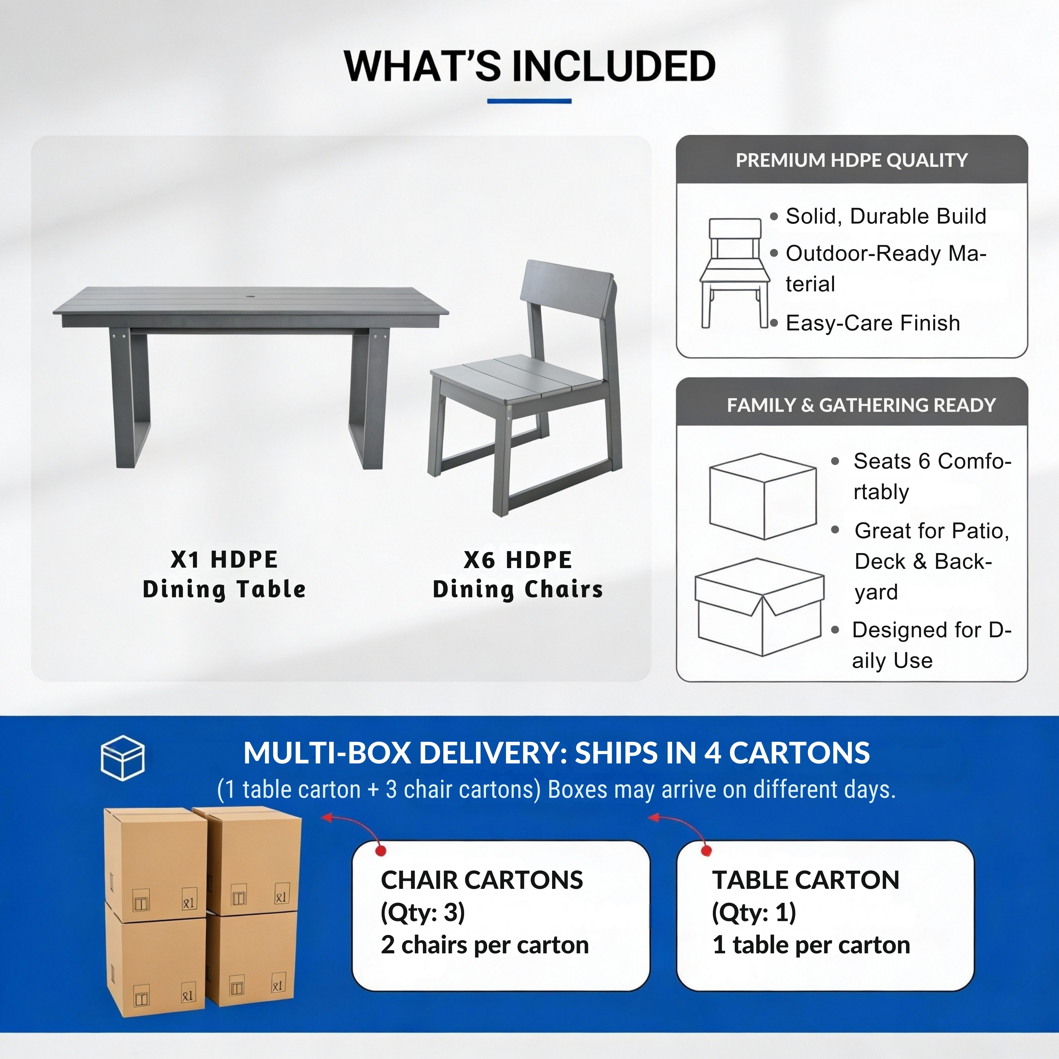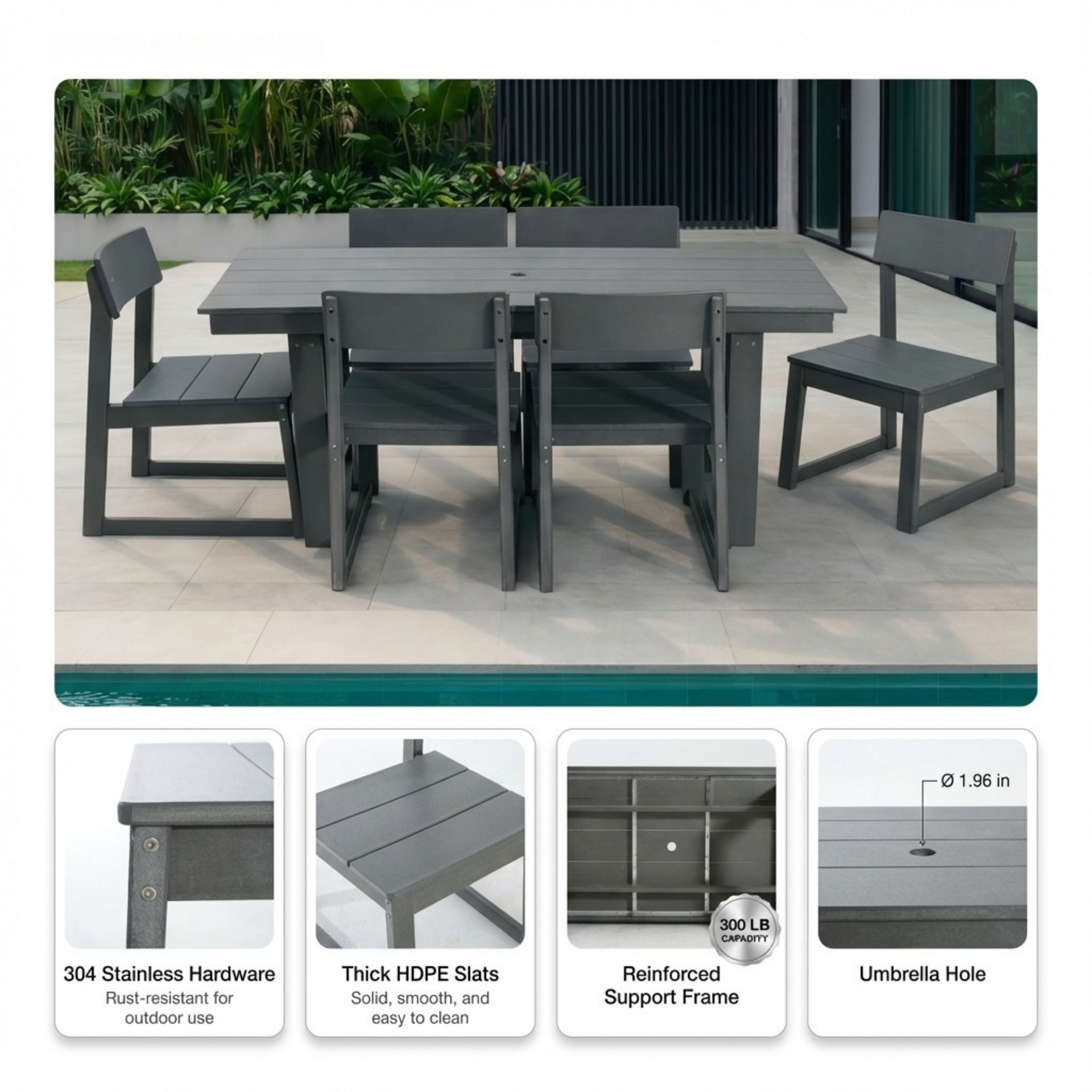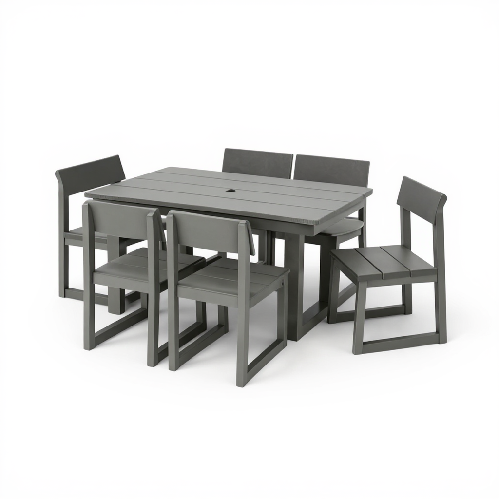 Product Name:7-Piece HDPE Outdoor Dining Set – All-Weather Patio Table with Umbrella Hole & 6 Armless Chairs, Heavy-Duty, Low-Maintenance, Commercial-Ready (Gray)