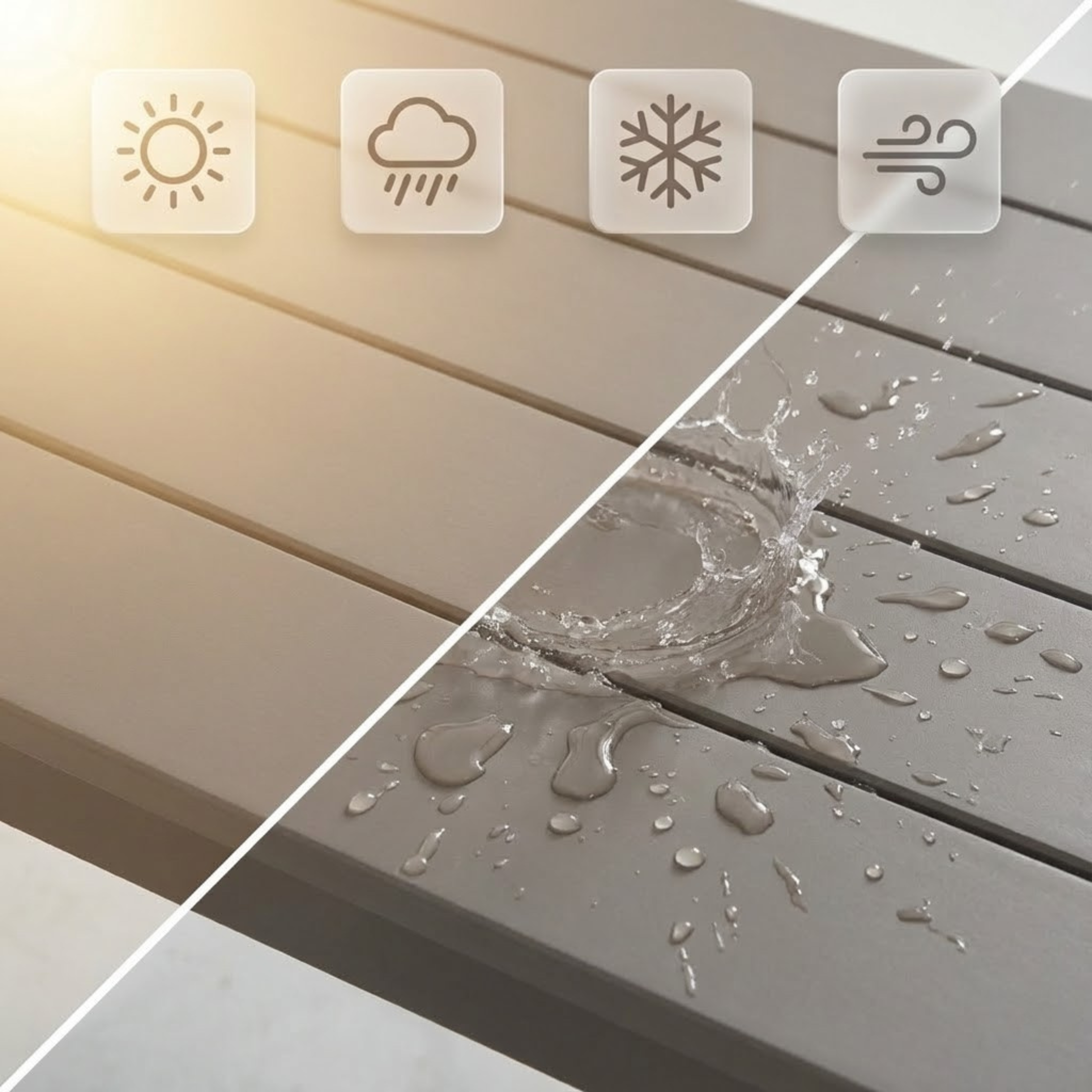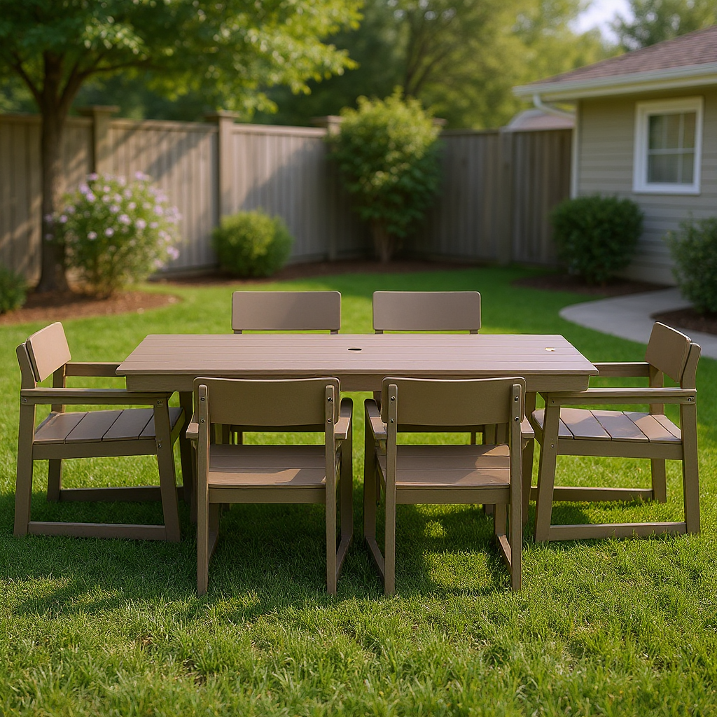 Product Name:7-Piece HDPE Outdoor Dining Set for 6 – Weather-Resistant Patio Table with Umbrella Hole and 6 Armrest Chairs, Durable Garden Furniture for Backyard, Lawn, Deck, or Poolside Ancient Oak