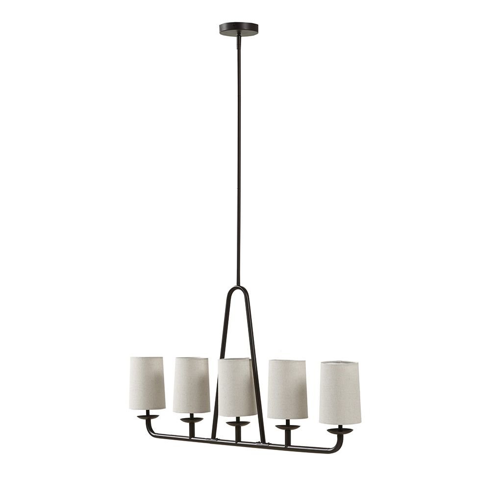 Illuminate your space with Serenitie 5-Light Chandelier from Ink + Ivy. This modern farmhouse-inspired light fixture boasts clean lines and a linear design. The tapered drum shades on oil rubbed bronze metal frame finish add sophistication and ambience. Its linear composition makes it ideal for kitchen islands, counters, and dining displays. With adjustable height and sloped ceiling adaptability, it offers versatility for any room. Bulbs are not included. Two-year warranty on parts.