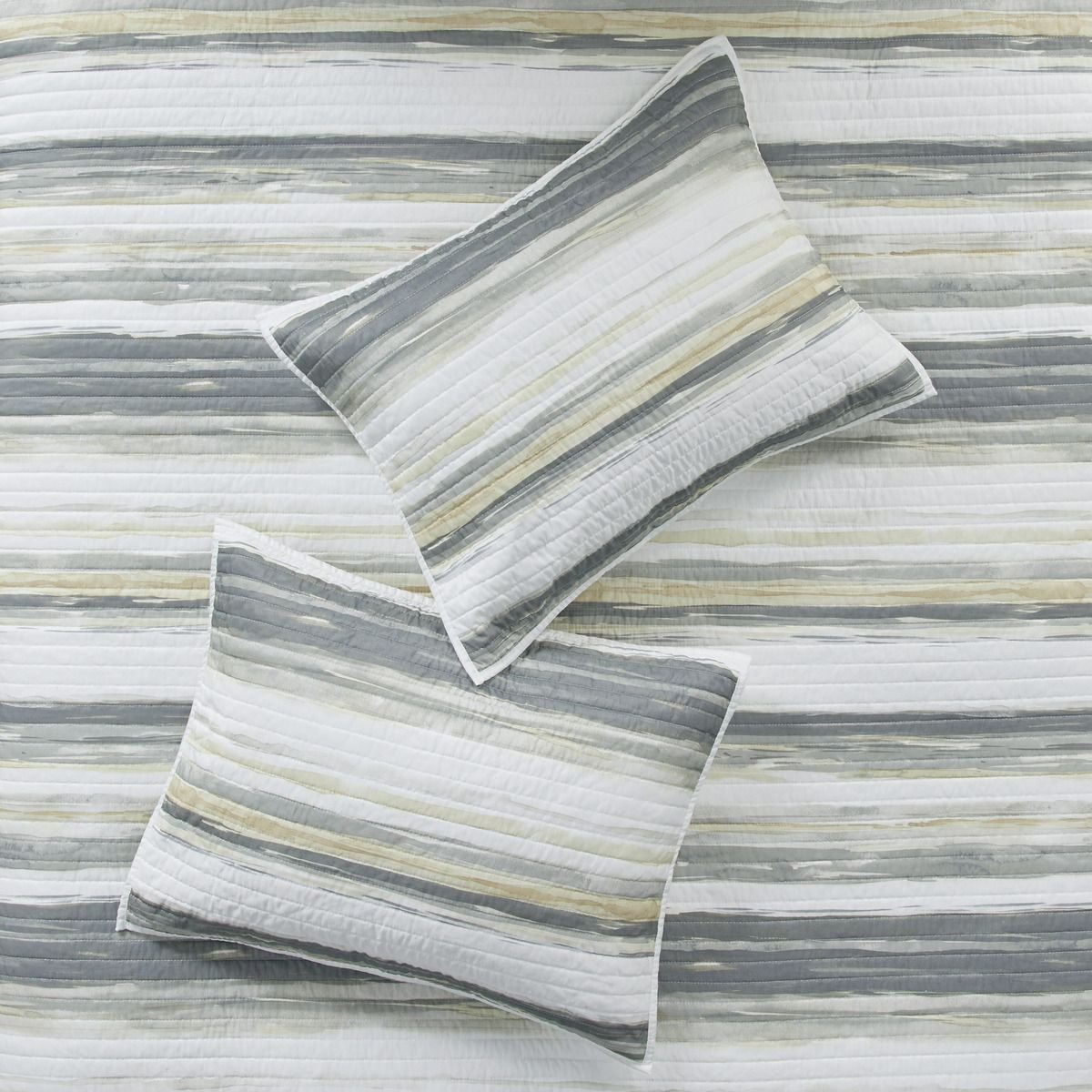 The quilt features watercolor stripe in muted yellow and gray hues and an off white reverse