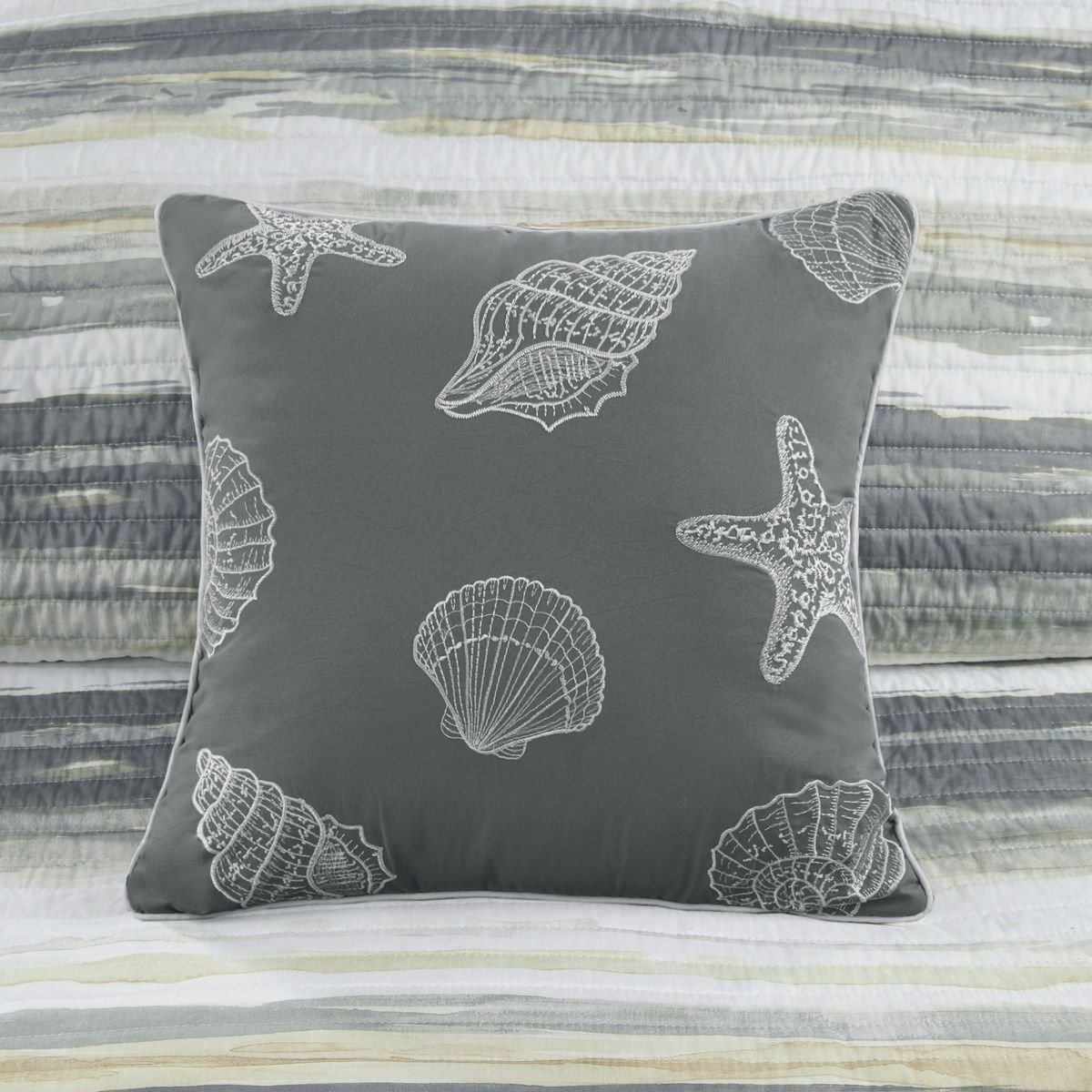 The Madison Park Marina 6 Piece Reversible Quilt Set provides a modern take on the coastal stripe. It's watercolor motif, accented with shades of yellow and gray, provides the calming feel of the beach in your space. Three decorative pillows use embroidered seashells and fabric manipulation to pull this look together.