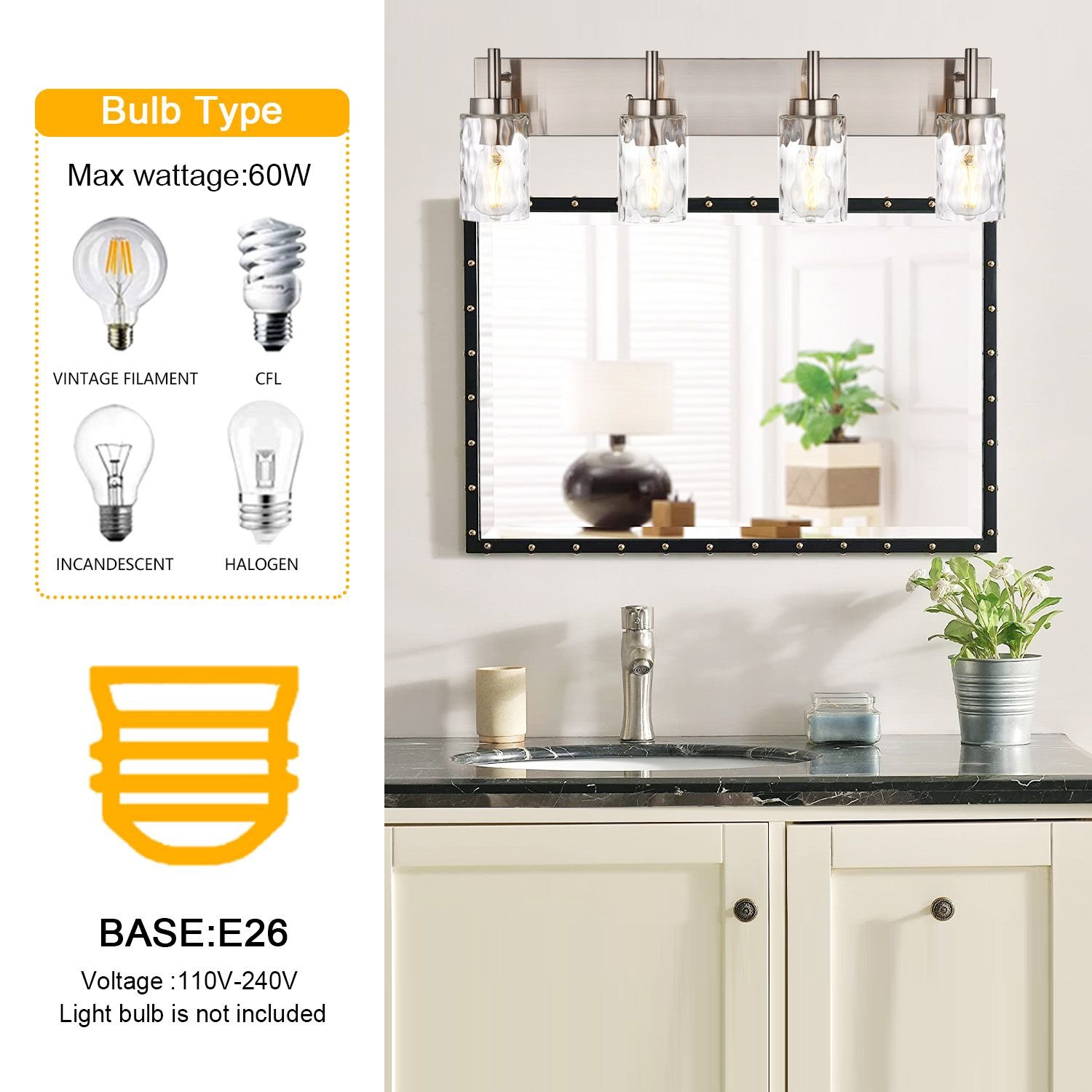 1.Bulb Type: E26 US Standard Socket. The brushed nickel vanity light wall sconce is suitable For LED,Incandescent,CFL, halogen bulbs and energy Saving Bulb. 60W Max. (Bulb Not Included)Dimmable:Fully dimmable when used with a dimmable bulb and compatible dimmer switch to create the perfect atmosphere.