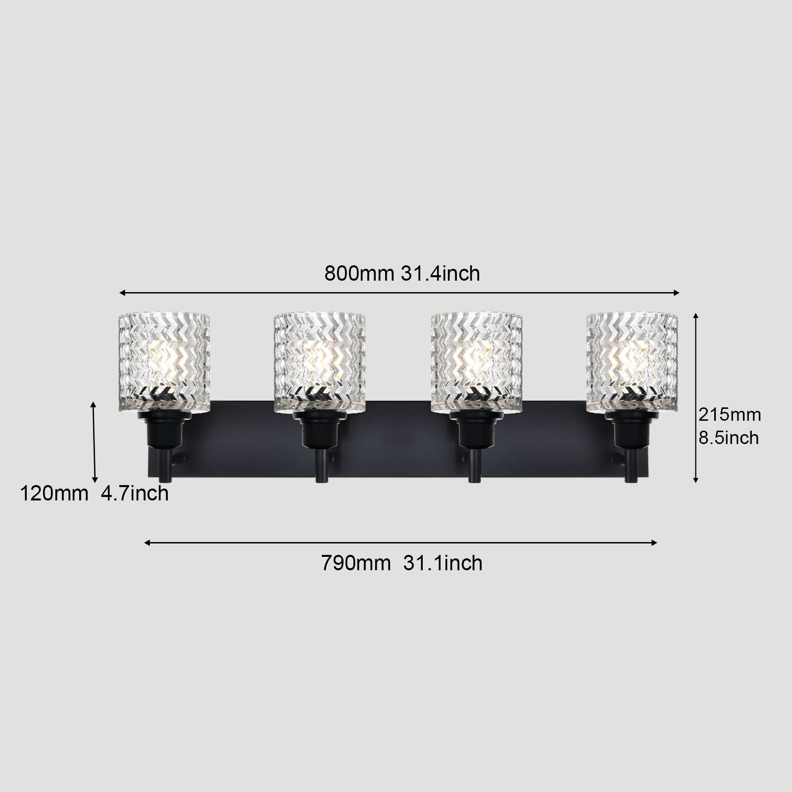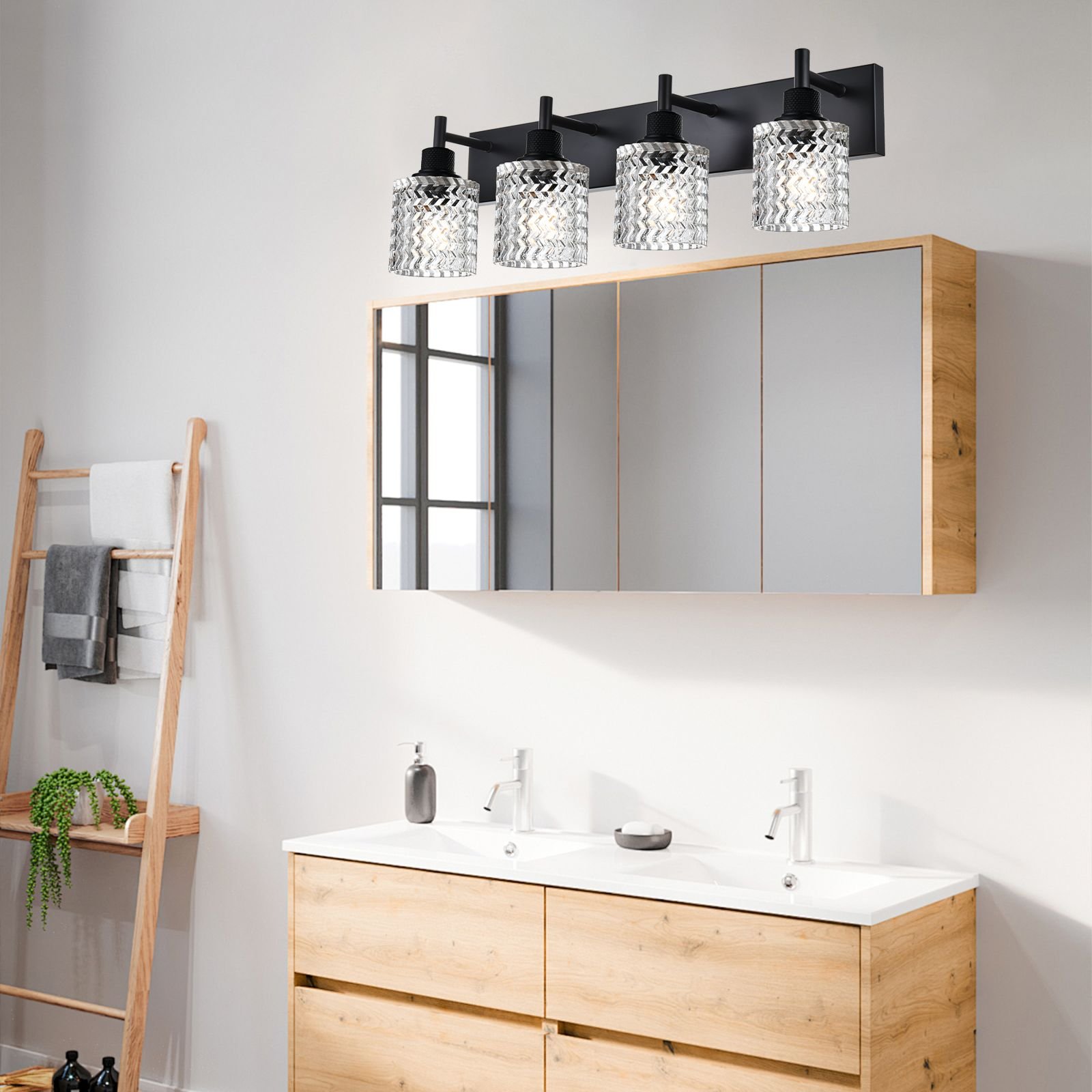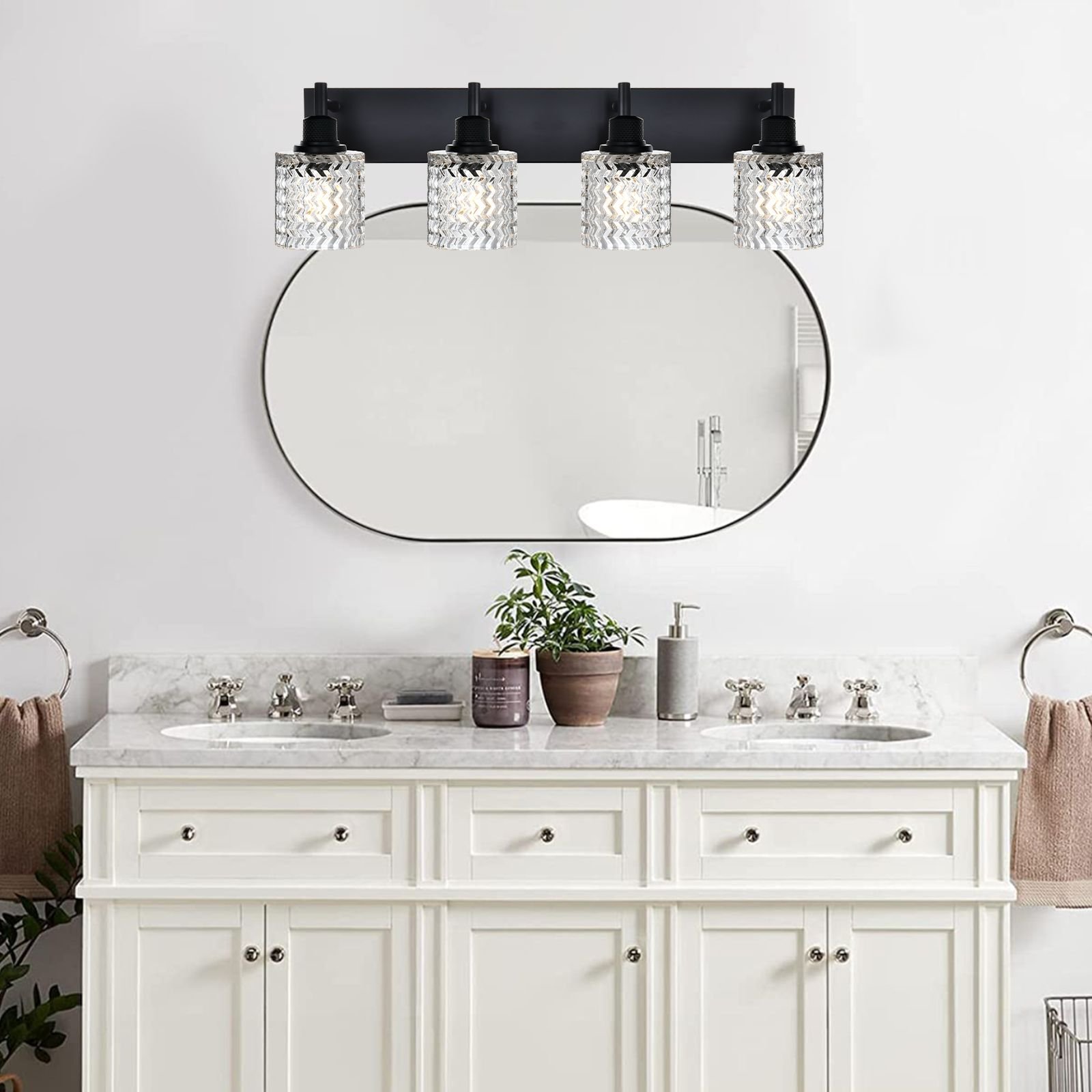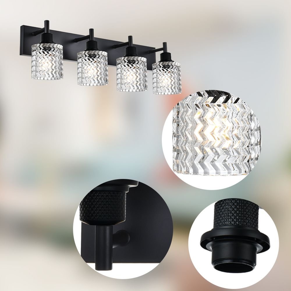 Unique Design: This bathroom vanity lighting crafted from metal in a black finish, and it has a backplate with a thin horizontal bar that supports four hammered glass shades. The glass shades have a clear, hammered design for a water-like effect. With a simple and luxurious design, they revitalize your bathroom and life.