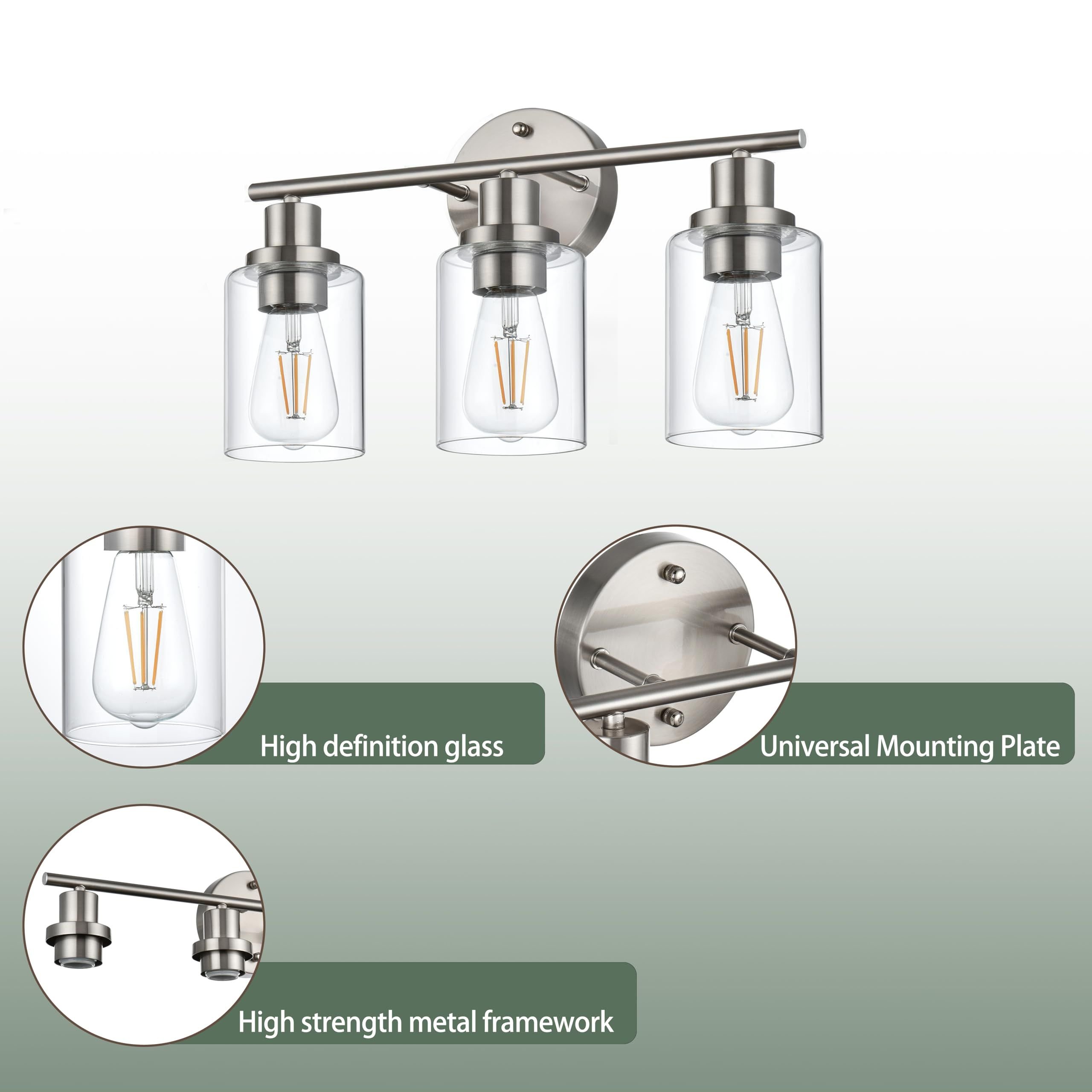 The Brushed Nickel bathroom light fixtures feature a sleek brushed nickel finish lamp body accompanied by clear glass shades. The upgraded finish not only adds an elegant touch but also includes a scratch and tarnish-resistant coating, ensuring that the brushed gold bathroom light maintains its pristine appearance over time. This exquisite bathroom vanity light is suitable for various decoration styles, making it the perfect choice to enhance your home lighting.