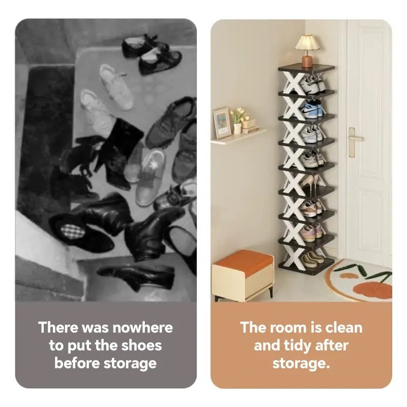 This ultra-slim vertical shoe rack holds up to 9 pairs of shoes while occupying minimal floor space. Perfect for tight areas like entryways, closets, dorms, or bathrooms, its stackable design adapts to your storage needs.