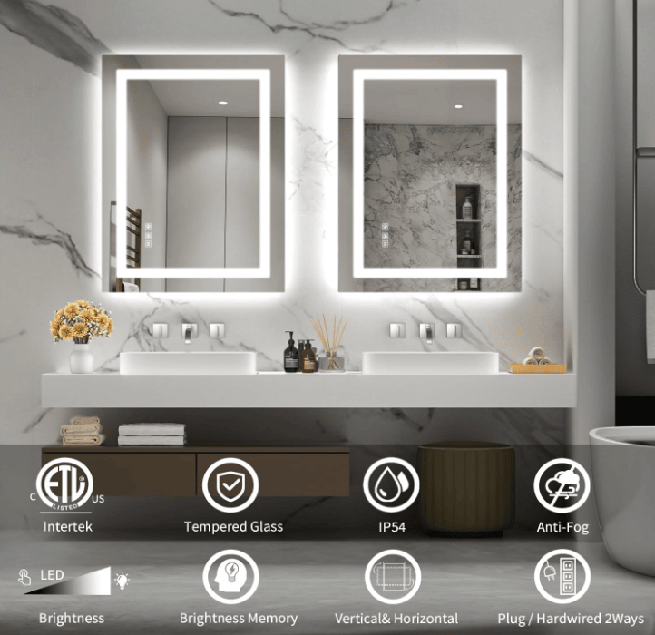 Backlight + headlight, light belt: LED bathroom mirror has a built-in LED light strip, which can control the backlight and headlight for lighting. The power supply and LED lights are UL certified and have a service life of more than 50,000 hours. It has two built-in IP54 waterproof LED strips to provide backlight and front light. The mirror is made of 4mm anti-broken tempered glass.